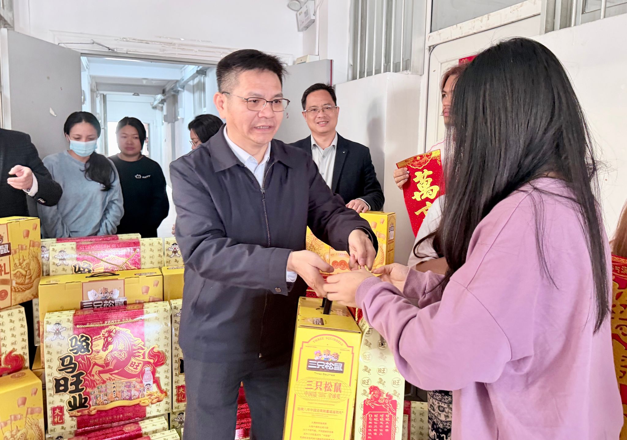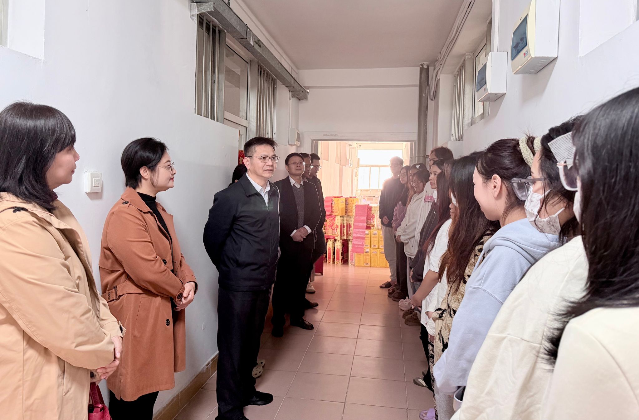 2月1日上午,学校校长隆广庆带领国际交流合作处、国际教育学院等相关部门人员一行,来到明秀校区国际学生宿舍,亲切看望并慰问寒假期间留校的国际学生,为他们送上诚挚的新春祝福与节日问候。