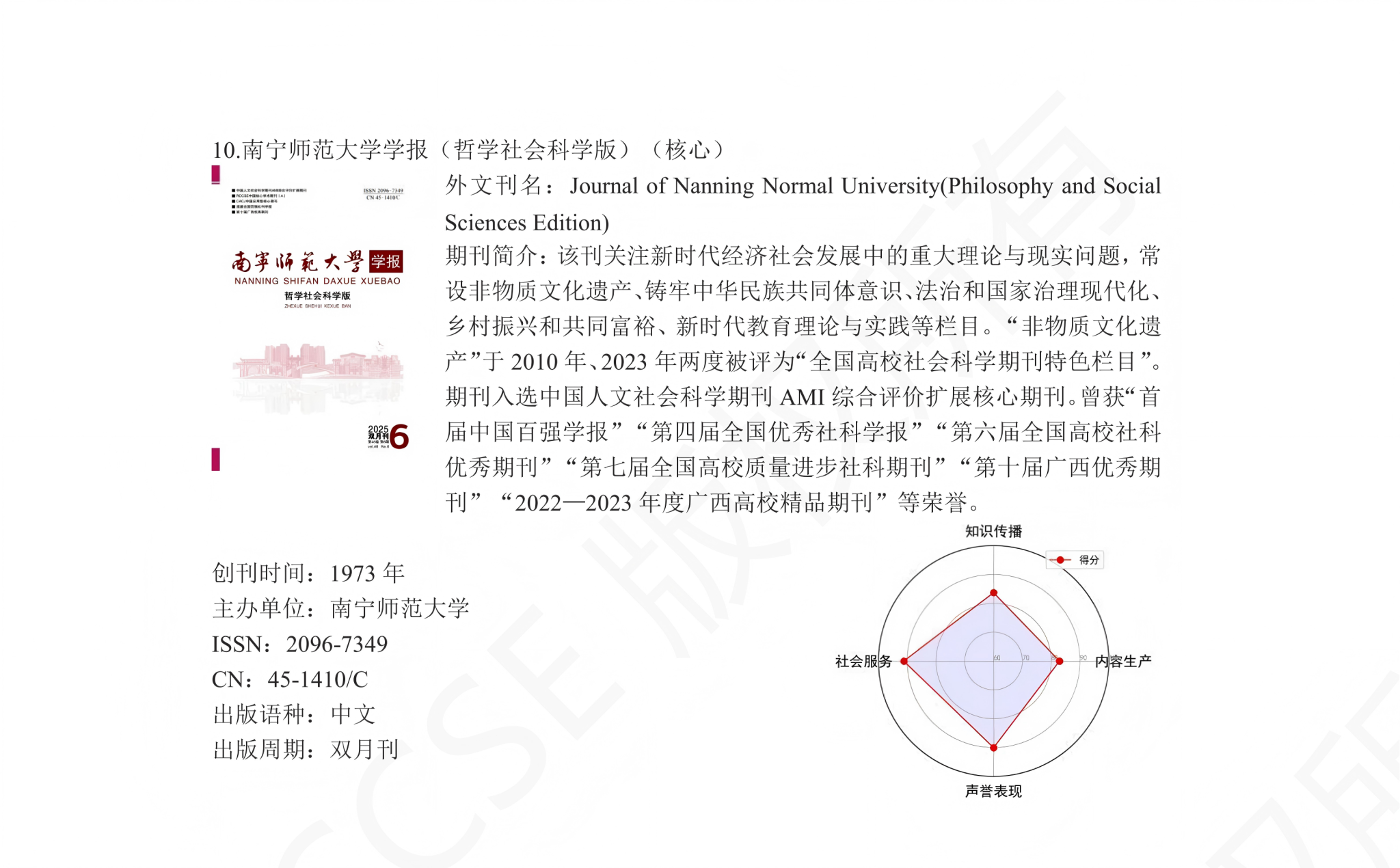 《best365足球官网学报(哲学社会科学版)》创刊于1973年,是由best365足球官网主管、主办的高校综合性人文社会科学学术期刊,双月刊,每逢单月1号出版。学报入选中国人文社会科学期刊AMI综合评价扩展期刊、RCCSE中国核心学术期刊(A),为首届全国百强社科学报、第十届广西优秀期刊。期刊关注新时代边疆民族地区经济、社会、文化发展中的理论与现实问题,强调问题导向,着重选用观点明确、结构严谨、论据充分、引证可靠、表达流畅、有创新性和学术价值的学术研究成果。常设栏目包括“非物质文化遗产”“铸牢中华民族共同体意识”“乡村振兴和共同富裕”“法治和国家治理现代化”“新时代教育理论与实践”,不定期开设“聚焦与对话”“数字经济和技术治理”“新时代人文视野”等栏目,每期根据重点选题和学术热点灵活策划相关专题。其中“非物质文化遗产”栏目于2010年、2023年两度被评为“全国高校社会科学期刊特色栏目”。