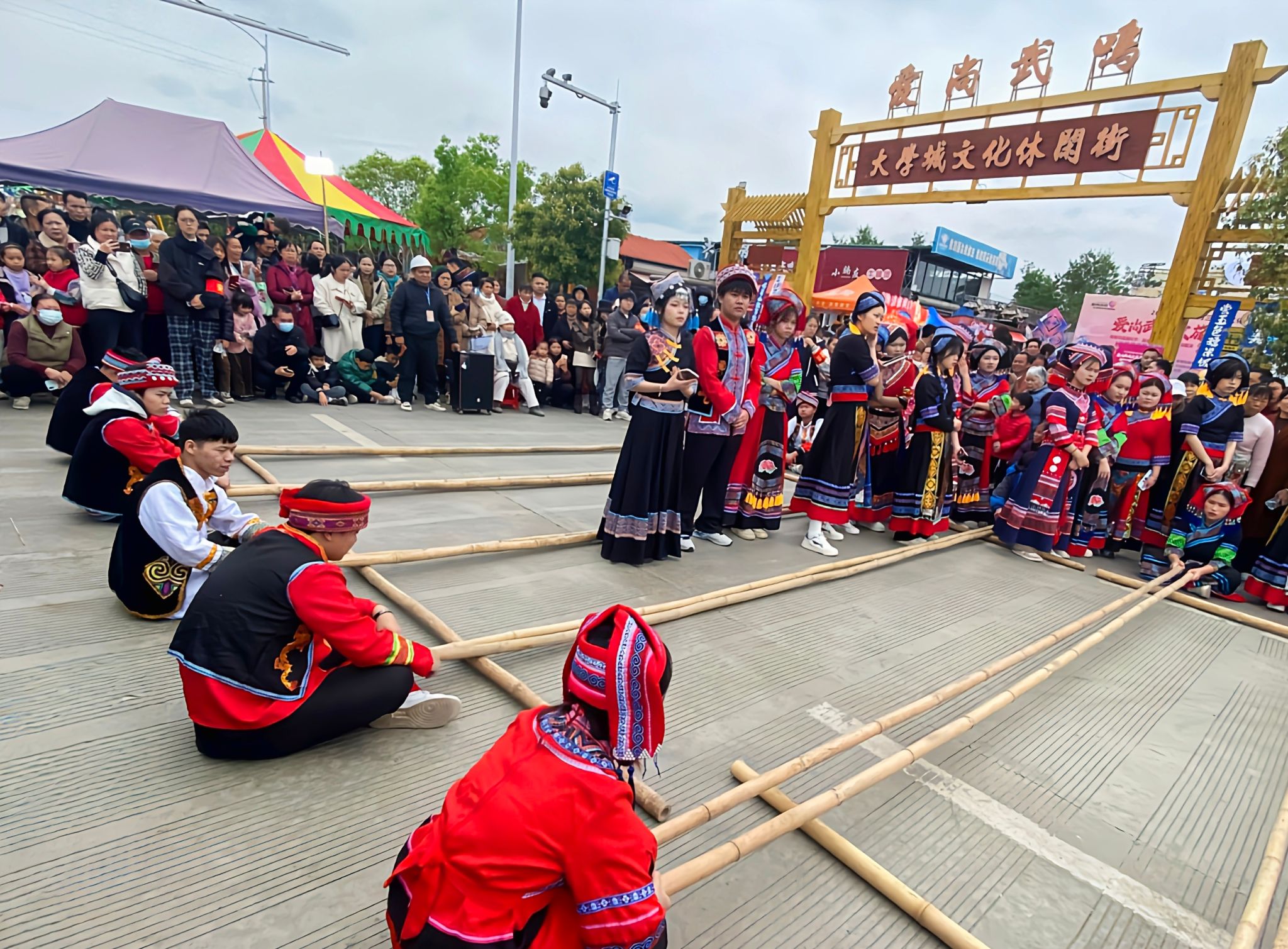 这场活动是当地为传承节日文化而举办,虽宣传不多,但仍热闹非凡,到处洋溢着欢快的氛围。一些同学勇敢加入,在舞者们的带领下,渐入佳境,跟着节奏尽情跳动;另一些同学在旁观察,交流讨论,传来热烈的掌声。欢快的竹竿舞,让大家感受到三月三这一节日的浓厚氛围,为大学生活增添了一份活力与欢乐。