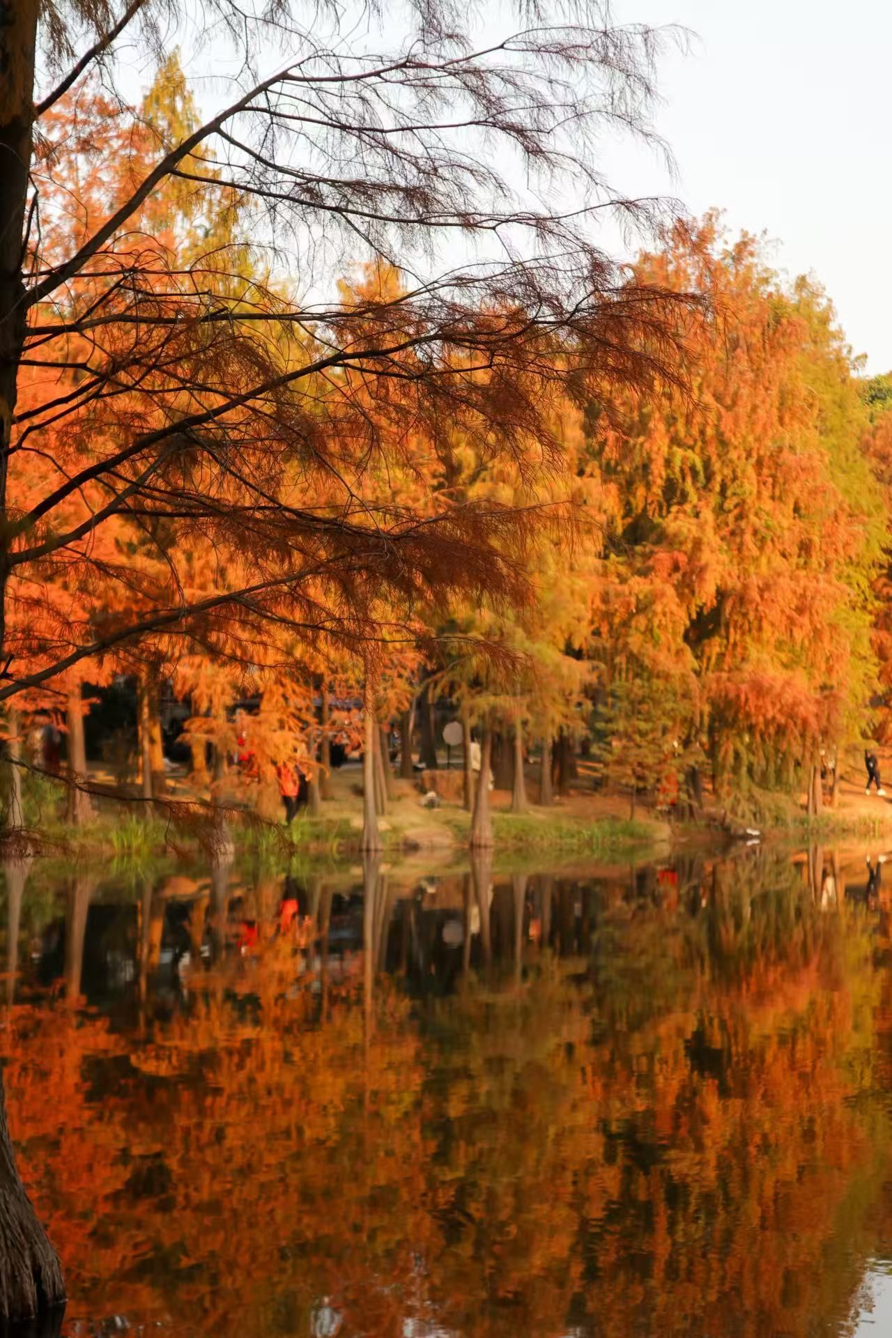在这季节的更迭中,校园的林荫道上,每一片飘落的黄叶都似在诉说着对夏日的眷恋与对秋日的期许。就像这张图片中的景象,水杉的叶子已染上了秋的色彩,橙红与金黄交织,倒映在平静的湖面上,宛如一幅精美的油画,让人沉醉不已。