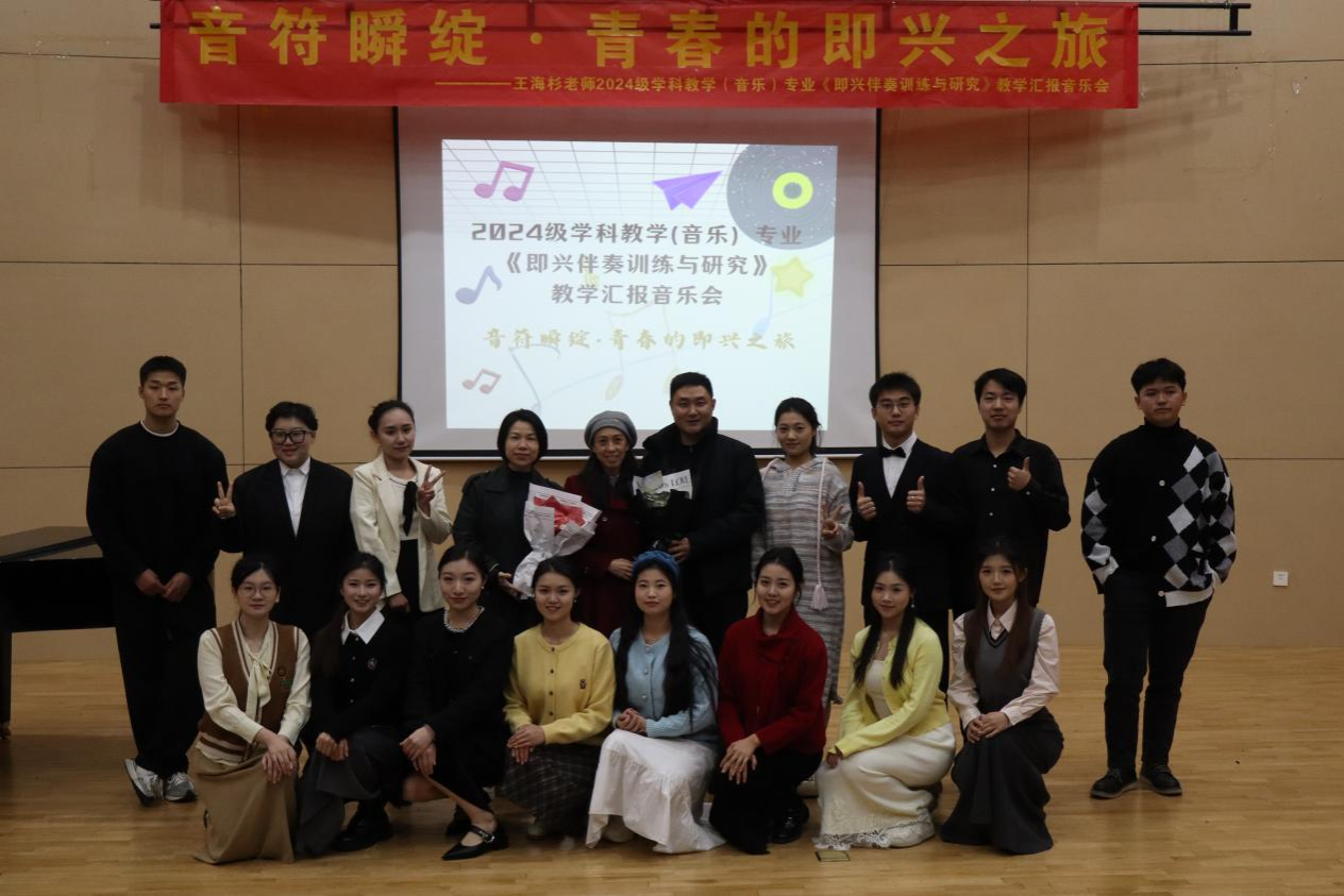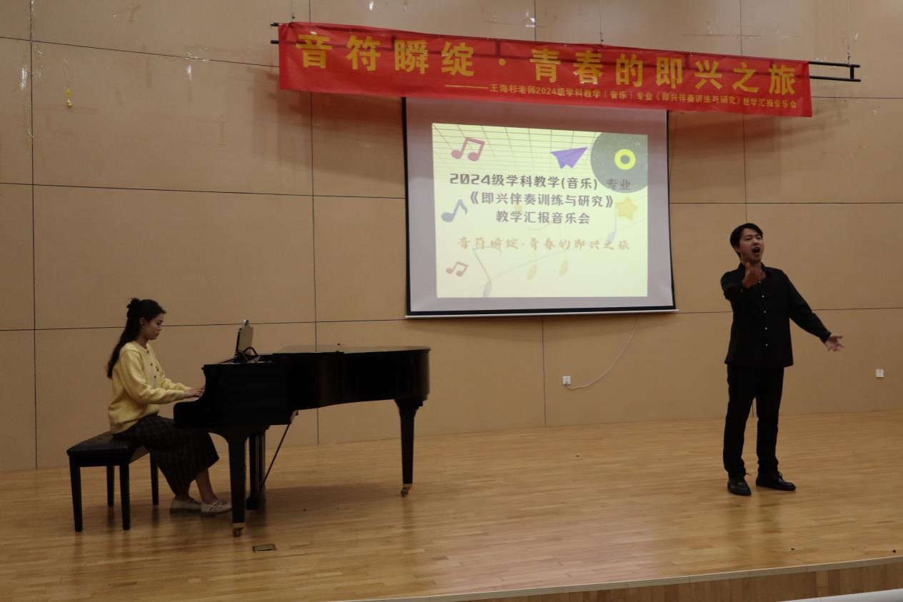 12月27日下午,音乐与舞蹈学院在A1009学术报告厅举办了题为“音符瞬绽——青春的即兴之旅” 的2024级学科教学(音乐)专业研究生即兴伴奏教学汇报音乐会。院长黄妙秋、教学教研部主任、指导老师王海杉及硕士研究生生导师蓝静出席了音乐会。