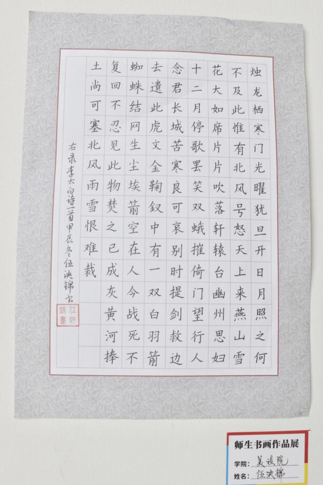 本次书画展精心策划了“传承篇”“革新篇”“未来篇”三个主题篇章。展出的作品涵盖了20幅精美的软笔书法、40幅硬笔书法以及23幅绘画佳作。活动现场,吸引了众多师生驻足欣赏。在作品展出期间,师生们积极互动,并现场挥毫泼墨,以笔墨传承中国传统文化。