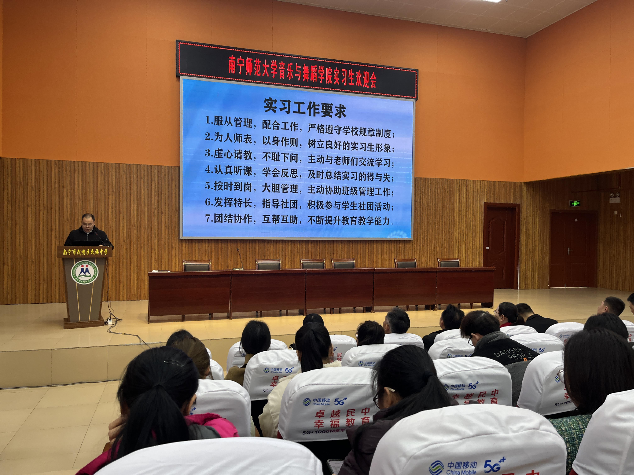3月10日下午,南宁市武鸣区民族中学在迎熙厅(小报告厅)召开best365足球官网音乐与舞蹈学院实习生欢迎会。武鸣区民族中学校领导、教师代表与best365官网音乐与舞蹈学院师生代表齐聚一堂,共同见证实习工作的正式启动。best365官网音乐与舞蹈学院师生约30人,以及民族中学七、八年级音乐教师、班主任、年级主任和相关处室负责人参加了会议。