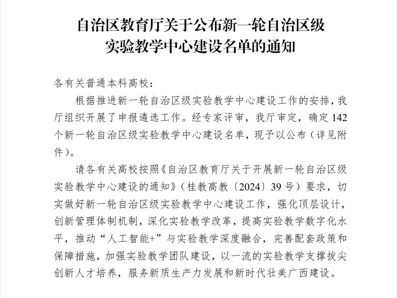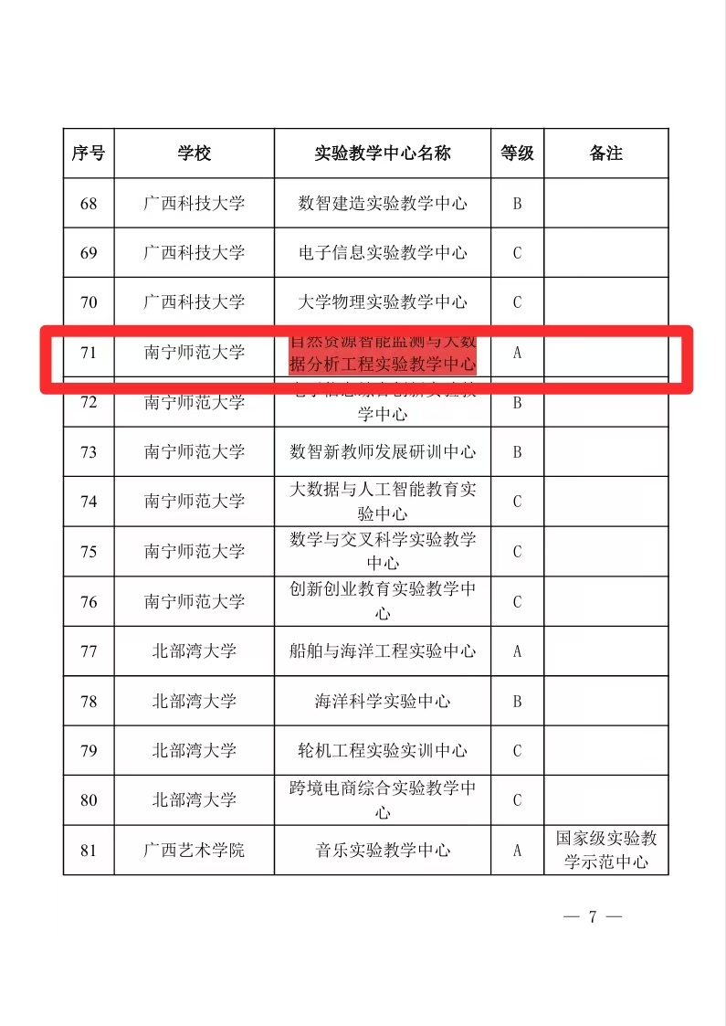 根据《自治区教育厅关于公布新一轮自治区级实验教学中心建设的通知》(桂教高教[2025]6号),经专家评审,自治区教育厅审定,best365官网自然资源与测绘学院段炼教授牵头申报的“自然资源智能监测与大数据分析工程实验教学中心”成功入选自治区级实验教学中心,且为本轮评选中best365官网唯一的A类中心。该中心既是学院实施党建引领高质量发展工程成果,也是继学院成功获批“卫星+”空间AI自然资源智能治理广西高校工程研究中心后,又一项教学科研平台的建设成果。