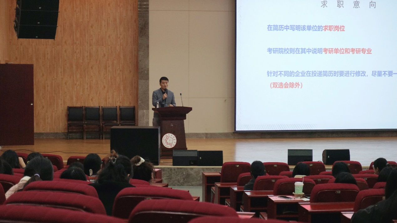 随后,学院开展求职专项辅导活动。环境科学专业曲炳鹏老师围绕简历撰写这一关键环节,从内容定制、排版优化、成果量化等多维度展开细致讲解,为毕业生传授简历制作的核心要点。特邀嘉宾贝宝珍则聚焦面试场景,围绕面试逻辑表达、礼仪形象管理等核心环节举例进行实际的技巧分享,助力毕业生提升求职成功率。