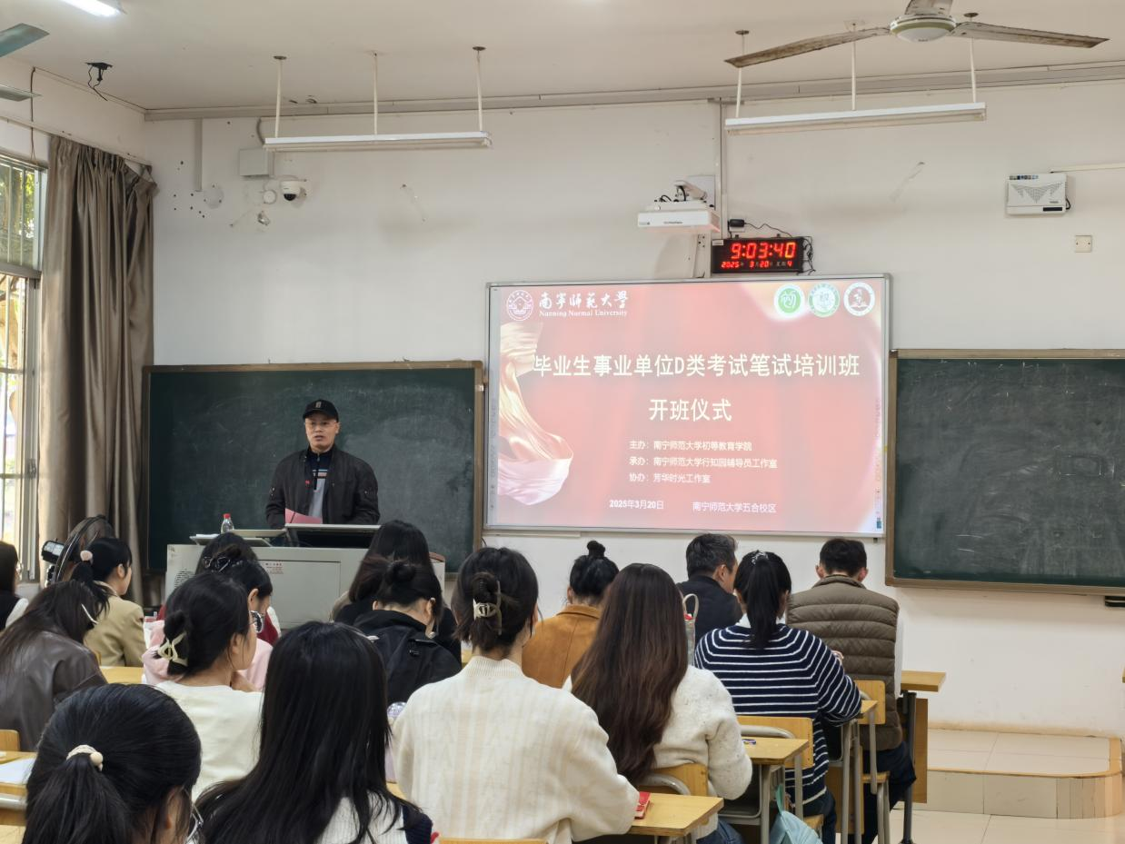 3月20日上午,毕业生事业单位D类(中小学教师类)考试笔试培训开班仪式在五合校区五综教学楼106教室举办。本次培训会由初等教育学院主办,行知园辅导员工作室承办,芳华时光工作室协办,面向全校毕业生开展线下培训。初等教育学院党委书记陆以宏、副书记苏学权、学工办辅导员等出席本次开班仪式。