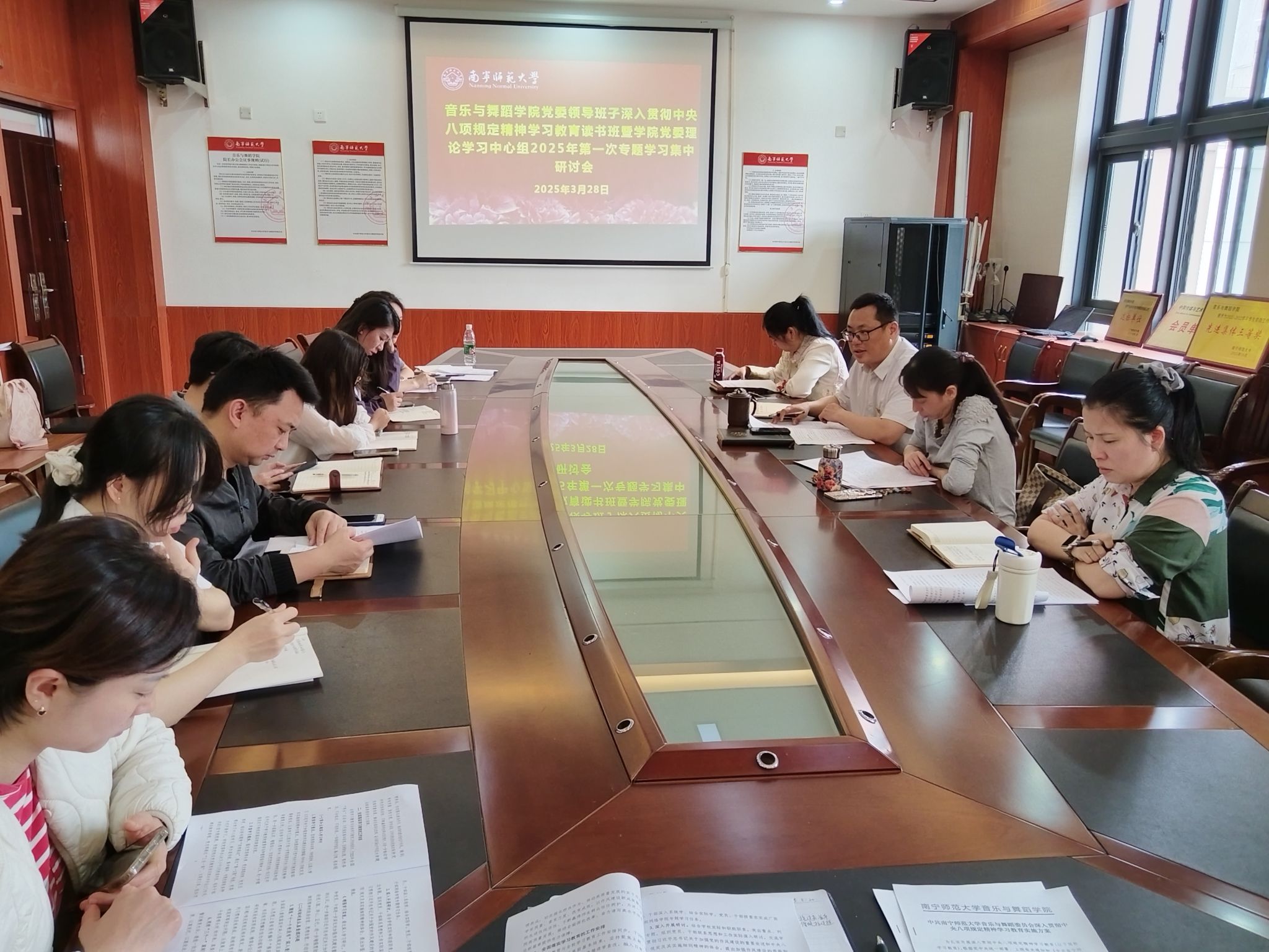 3月28日,音乐与舞蹈学院党委深入贯彻中央八项规定精神学习教育读书班暨学院党委理论学习中心组2025年第一次专题学习集中研讨会在音舞楼会议室召开。学院党委书记陈宇主持会议,学院党委理论学习中心组成员参加了学习,纪委委员、各党支部书记列席。