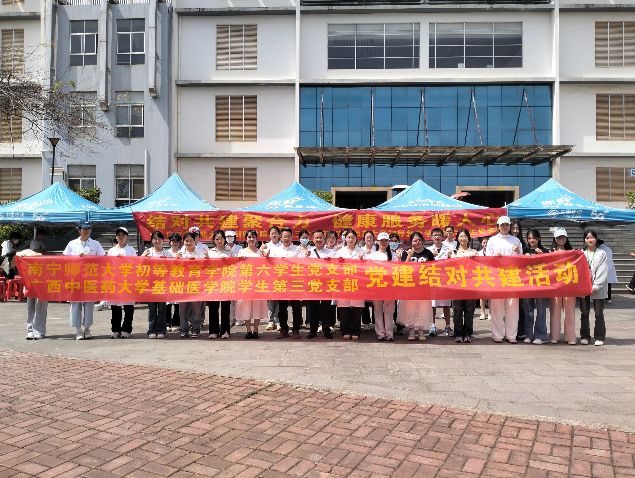 为了深入贯彻落实健康中国战略,加强校园健康教育,提升师生健康意识,4月15日下午,best365足球官网初等教育学院第六学生党支部联合广西中医药大学基础医学院学生第三党支部在best365足球官网五合校区桃李苑食堂正门开展“结对共建聚合力,健康服务暖人心”党建结对共建活动。