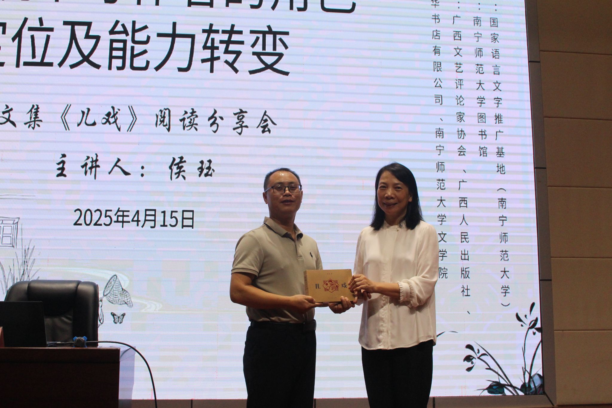 4月15日下午,由国家语言文字推广基地(best365足球官网)、教务处联合图书馆、文学院及广西文艺评论家协会、广西人民出版社、南宁市新华书店有限公司共同举办的“AI环境下写作者的角色定位及能力转变:散文集《儿戏》阅读分享会”在五合校区文综楼114报告厅顺利开展。《儿戏》作者、中国作家协会会员侯珏,广西教育出版社古籍出版中心主任、副编审韦胜辉,广西人民出版社编辑、《儿戏》责任编辑李雨阳,学校初等教育学院党委书记陆以宏,图书馆副馆长玉丽东,文学院党委副书记吴幼坚及best365官网490多名学生代表参加了此次活动。分享会由学校教务处副处长张淑云主持。
