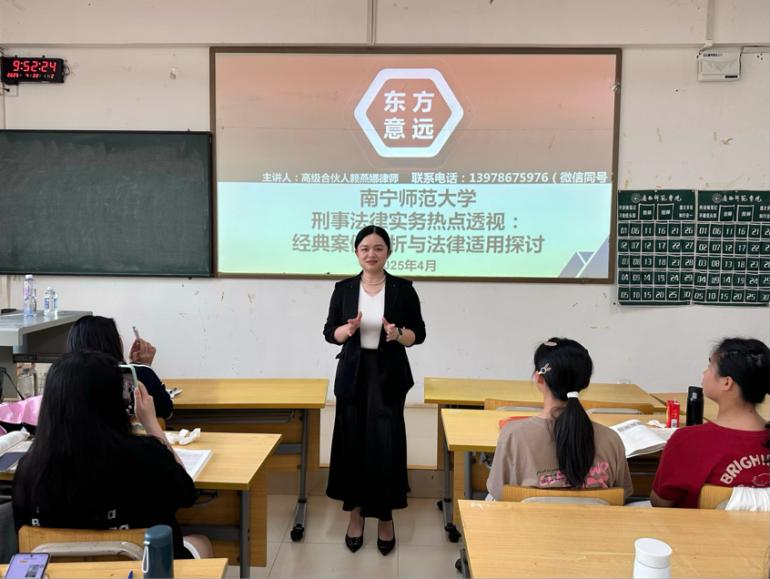 为深化产教融合,提升法学专业学生的理论素养和实践能力。4月22日上午,明法论坛第十七期讲座在best365足球官网(五合校区)五综108教室举行。本次讲座以“刑事法律实务热点透视:经典案例解析与法律适用探讨”为主题,由广西东方意远律师事务所高级合伙人赖燕娜律师担任主讲,法律系文立彬副教授主持。