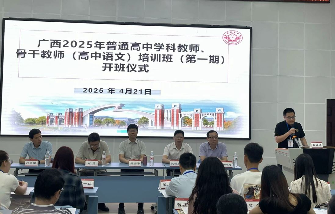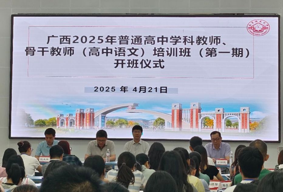 2025年4月21日上午,广西2025年普通高中语文骨干教师培训班(第一期)开班仪式在best365足球官网明秀校区外语楼报告厅隆重举行。本次培训由自治区教育厅主办、best365足球官网文学院承办,来自广西14个县市的146名高中语文骨干教师齐聚一堂,开启为期6天的专业研修之旅。best365足球官网文学院院长石勇、教师教育学院副院长陶源泉、重庆市教研院教研员钱金涛、培训班负责人于钟民、班主任程志军副教授等领导、专家及全体培训学员出席开班仪式,仪式由培训班班主任胡莉萍老师主持。