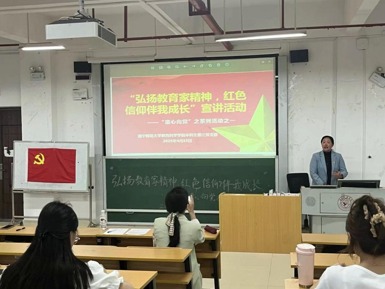4月17日,教育科学学院本科生第三党支部在五合校区文综415教室开展了“童心向党——弘扬教育家精神,红色信仰伴我成长”主题教育活动。学院党委书记余朝文、党委副书记谢珊、学前特教教工党支部陆春行老师、本三党支部书记李新园参加本次活动,参加活动的还有本科生第三党支部全体党员同志、本科生第一党支部中共党员同志代表和本科生第一党支部中共党员同志代表。