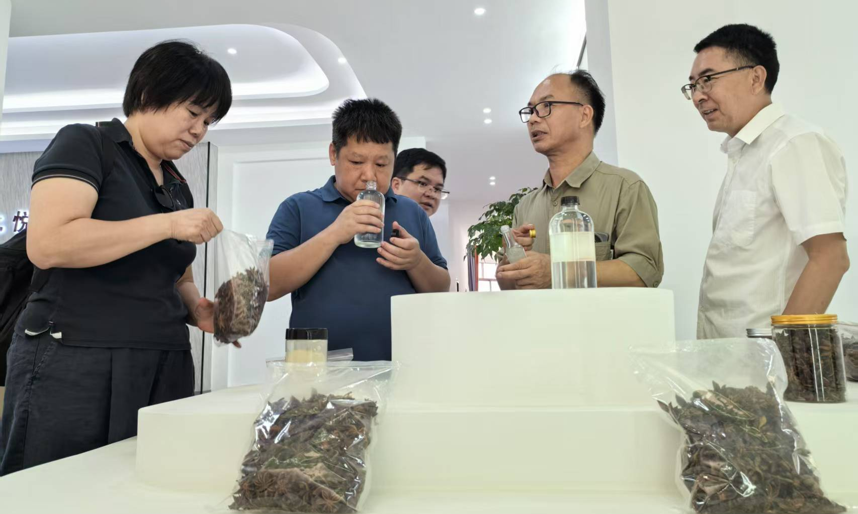 广西是全国八角原产地和主产区,八角种植面积和产量占比均超过全国总量的80%。钦州浦北县六硍镇种植八角近15万亩,在香料市场上具有较强的竞争力。六硍镇人大主席杨帆等热情接待了调研组,并带领调研组先后现场考察调研了300亩八角“改低创高”示范基地、钦州浦北悦沣农业公司八角加工车间以及产品展示区。考察调研组检测土壤性状,并使用无人机采集八角示范基地的地面数据信息。