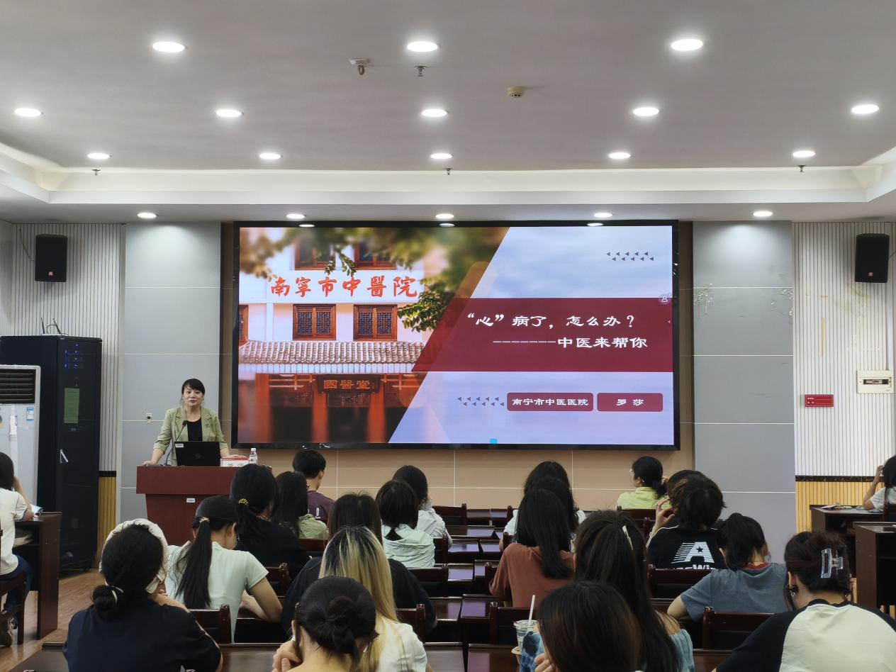 5月13日下午,学校学工部邀请南宁市中医医院罗莎副院长在五合校区理综1003教室开展了中医防治情志病讲座,我院70名学生聆听了讲座。本次讲座通过“理论解析+视频示范+沉浸式体验”三维模式,为大家揭开“心病”的中医防治密码。