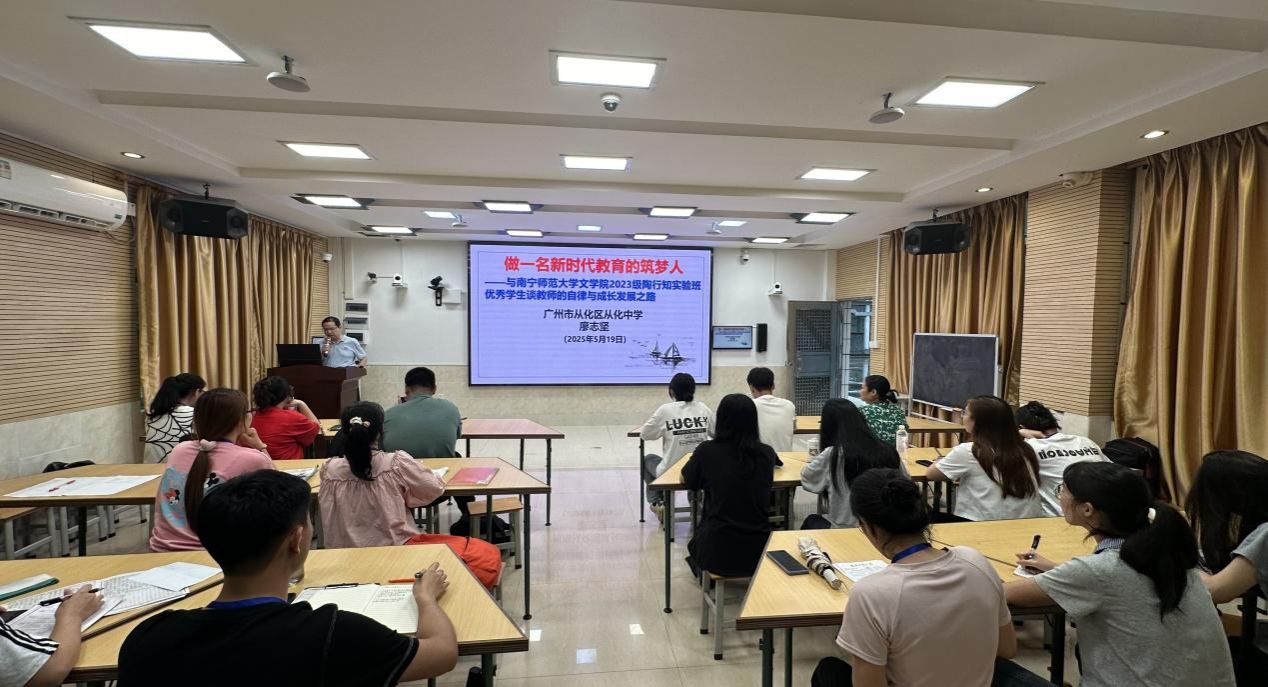 下午,从化中学党委书记廖志坚为见习生开展了“做一名新时代教育的筑梦人——与best365足球官网文学院2023级陶行知实验班优秀学生谈教师的自律与成长发展之路”的专题讲座。