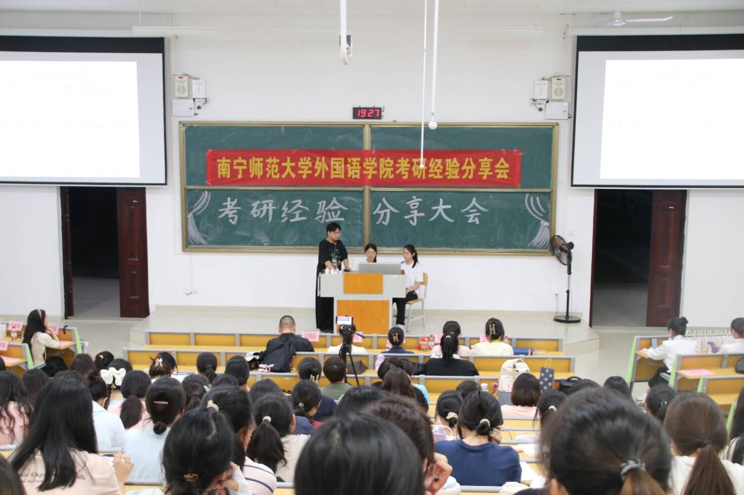 为帮助学院大一至大三的同学们尽早开启职业生涯规划、明确考研目标、掌握备考技巧、激发学习动力,5月15日晚7点,外国语学院在实验楼2A-105教室举办考研经验分享会。学院党委刘晖晖副书记、学工办黄慧梅老师、黄恬老师出席本次活动。本次宣讲会由李昊、刘雅婷、张彬彬、张珂菲、侯文达、黄伊琳、刘星雨、卫元彤、刘茜茜9位考研成功上岸的同学主讲,共有近200位同学积极参与。