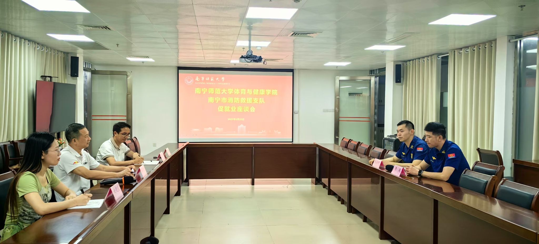 为进一步落实2025届毕业生就业工作,5月23日,体育与健康学院邀请南宁市消防救援支队入校开展促就业座谈会及招聘宣讲会。会议分别在武鸣校区3号实验楼1517会议室、2号实验楼B108教室举行,学院党委书记磨有积、副书记陈军弟及学工办老师出席,超80名毕业班学生参加招聘宣讲会。