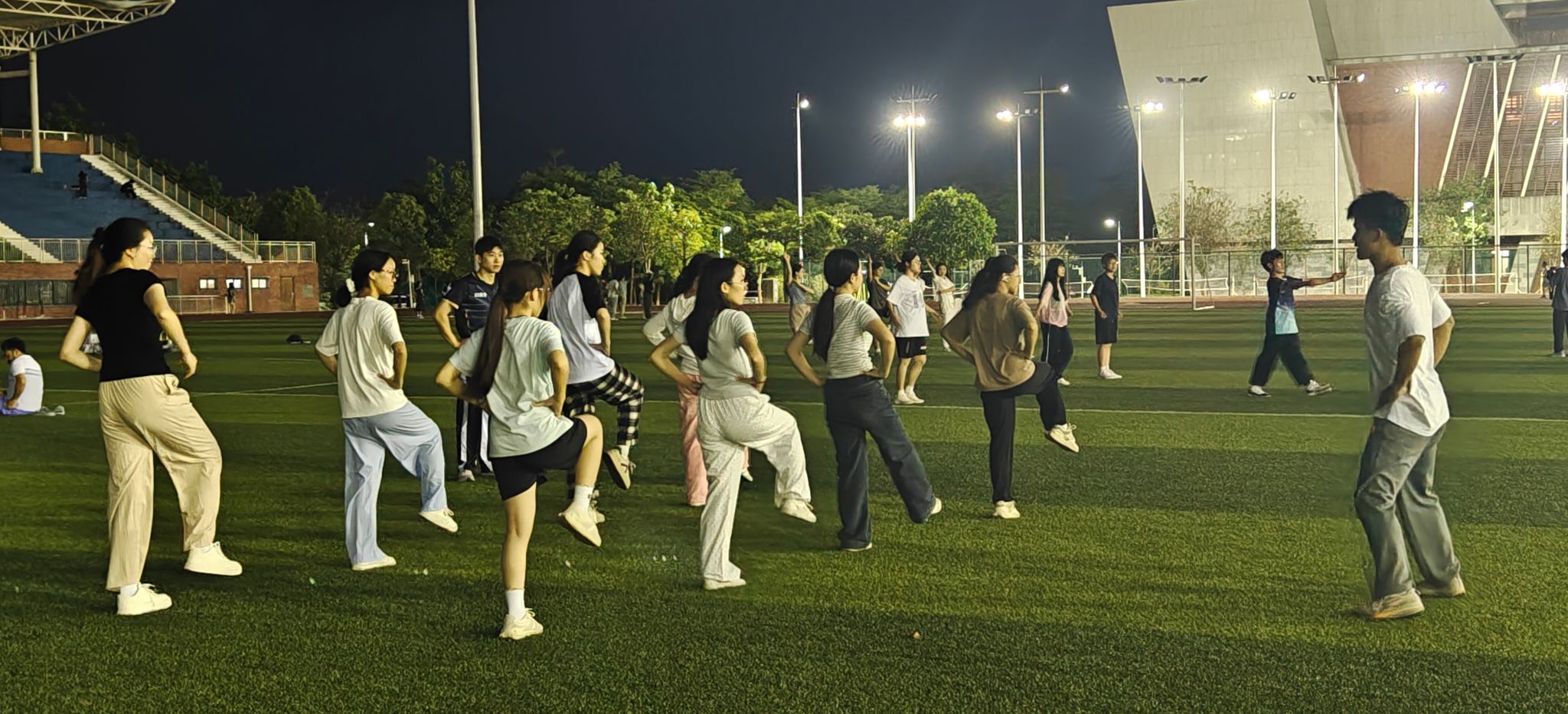 夏夜繁星闪烁,操场灯火通明,松园田径场化身为武术课堂。本次武术夜校教练团队由武术协会学生组成,结合趣味教学法,将八段锦的舒缓柔美与五步拳的刚劲利落融入课程,通过口诀记忆、分组比拼等方式,让零基础学员快速掌握动作要领。活动过程还融入健身知识科普、运动损伤防护技巧等内容,帮助学员们科学锻炼。训练过程中,学员们手持夜光器械,一招一式在灯光下整齐划一,展现出学习武术的顽强精气神,成为校园独特的文化风景线。“从手脚不协调到能完整打出套路,武术让我变得更自信!”许多学员因此次武术夜校结缘,组建起“夜练小分队”,发挥交流平台作用。