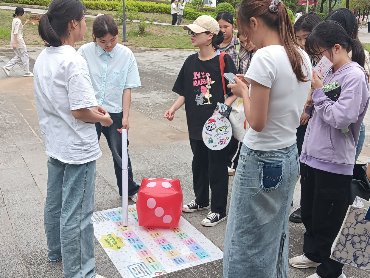 子活动二为“‘愈’见心晴,5.25心灵狂欢集”为主题的心理健康日相“愈”集市活动。通过趣味游戏、艺术疗愈等多元形式,普及情绪管理、压力应对等实用心理知识,引导学生正视心理问题,推动从“心理生存”到“心理成长”的积极转变,助力营造包容、向上的校园文化生态。旨在帮助学生释放压力、提升心理调适能力,营造温暖包容的校园心理氛围。本次活动设置了集章和集赞环节。在“词”外之音小栈,参与者或是独自挑战,或是组队协作,在禁用“你、我、他”三字的规则下演唱歌词,用独特的方式诠释歌曲,现场充满欢声笑语;在解忧调色艺术馆,同学们能沉浸于色彩的奇妙世界,借画笔释放压力、挥洒创意,收获心灵的治愈与创作的成就感,让烦恼在缤纷色彩中悄然消散 。手舞模仿站中,同学们认真学习手势舞,用灵动的双手传递快乐。“盒”你倾诉小卖部别具一格,“情绪垃圾箱”和“开心分享箱”为同学们提供了情绪抒发与分享的空间,大家积极抽取纸条分享经历、出谋划策,增进了彼此的理解与支持 。