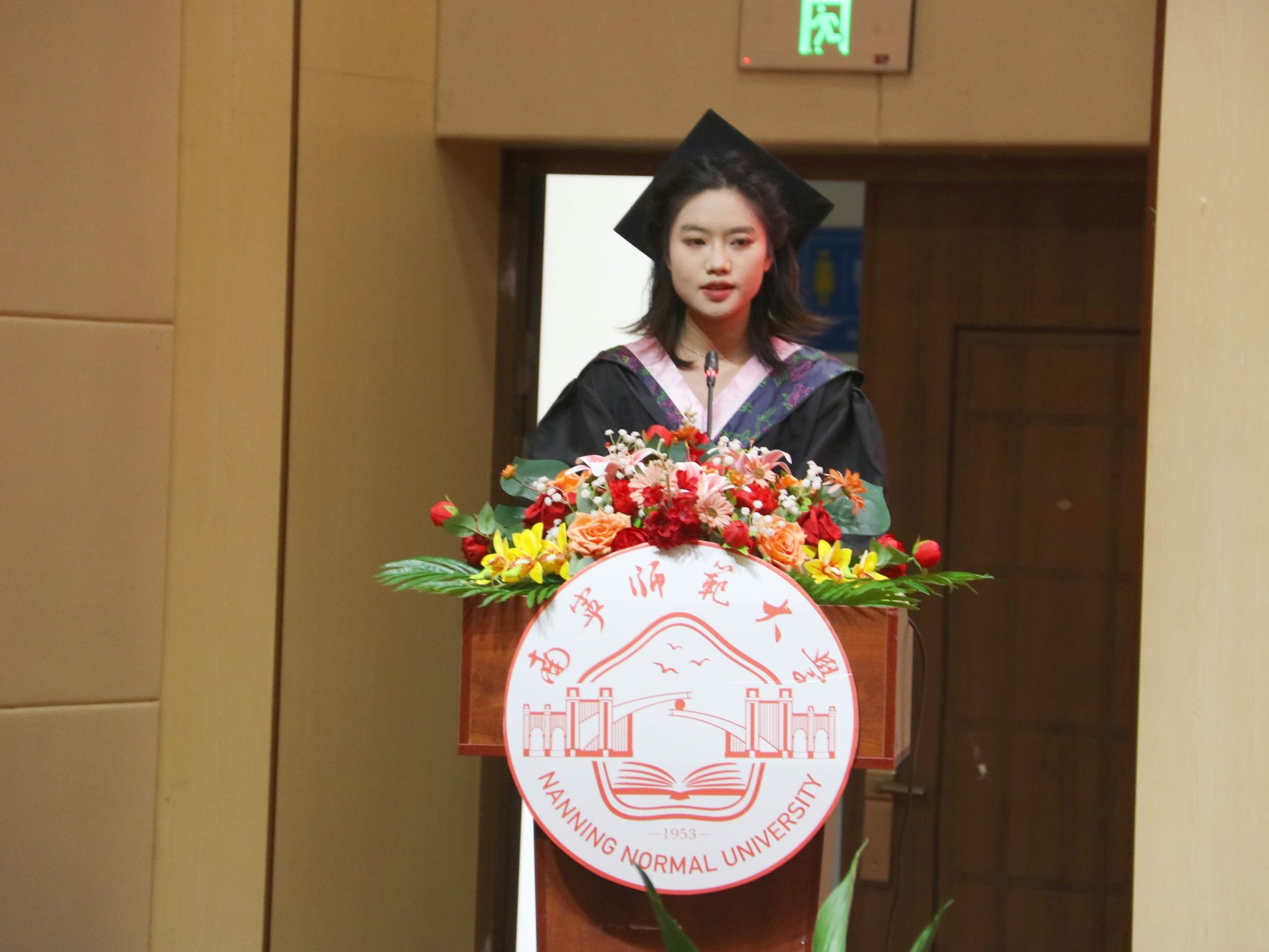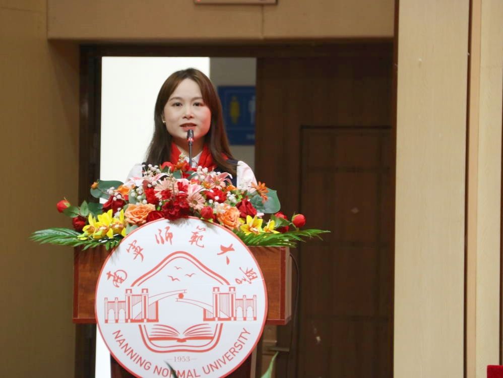 接着,校友代表、教师代表、毕业研究生代表和毕业本专科生代表分别发言。其中,校友代表、南宁市五象新区第一实验小学政教处副主任、全国优秀少先队大队辅导员陈媚以“从讲台到讲台”的职业经历分享感悟,勉励学弟学妹们以专业素养与教育情怀照亮教育的浩瀚星空。