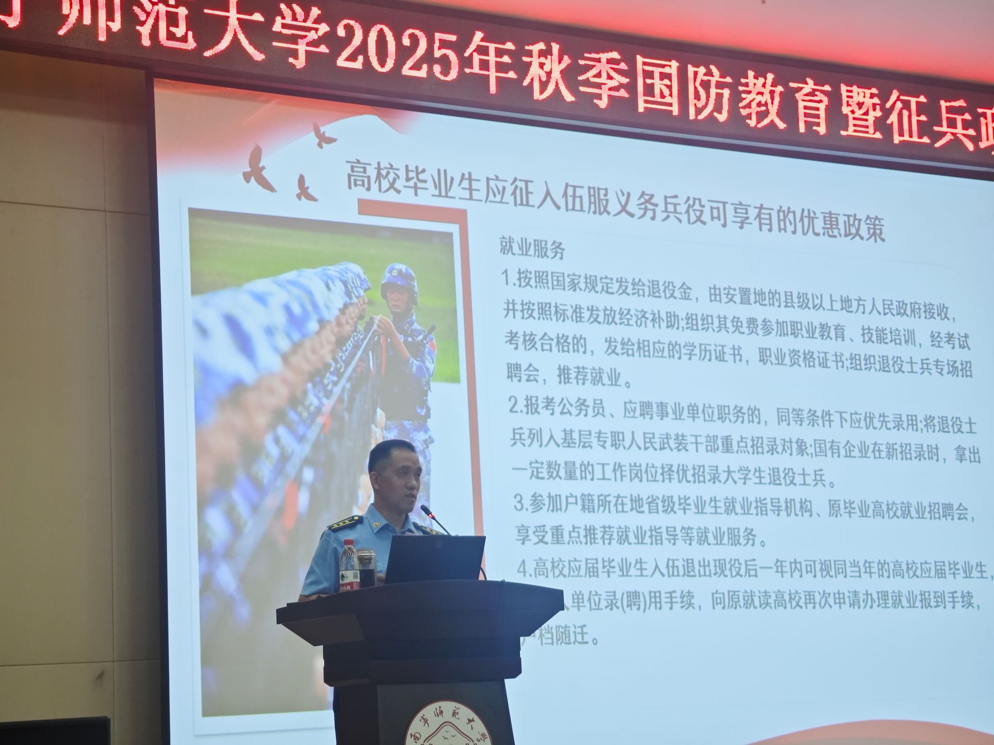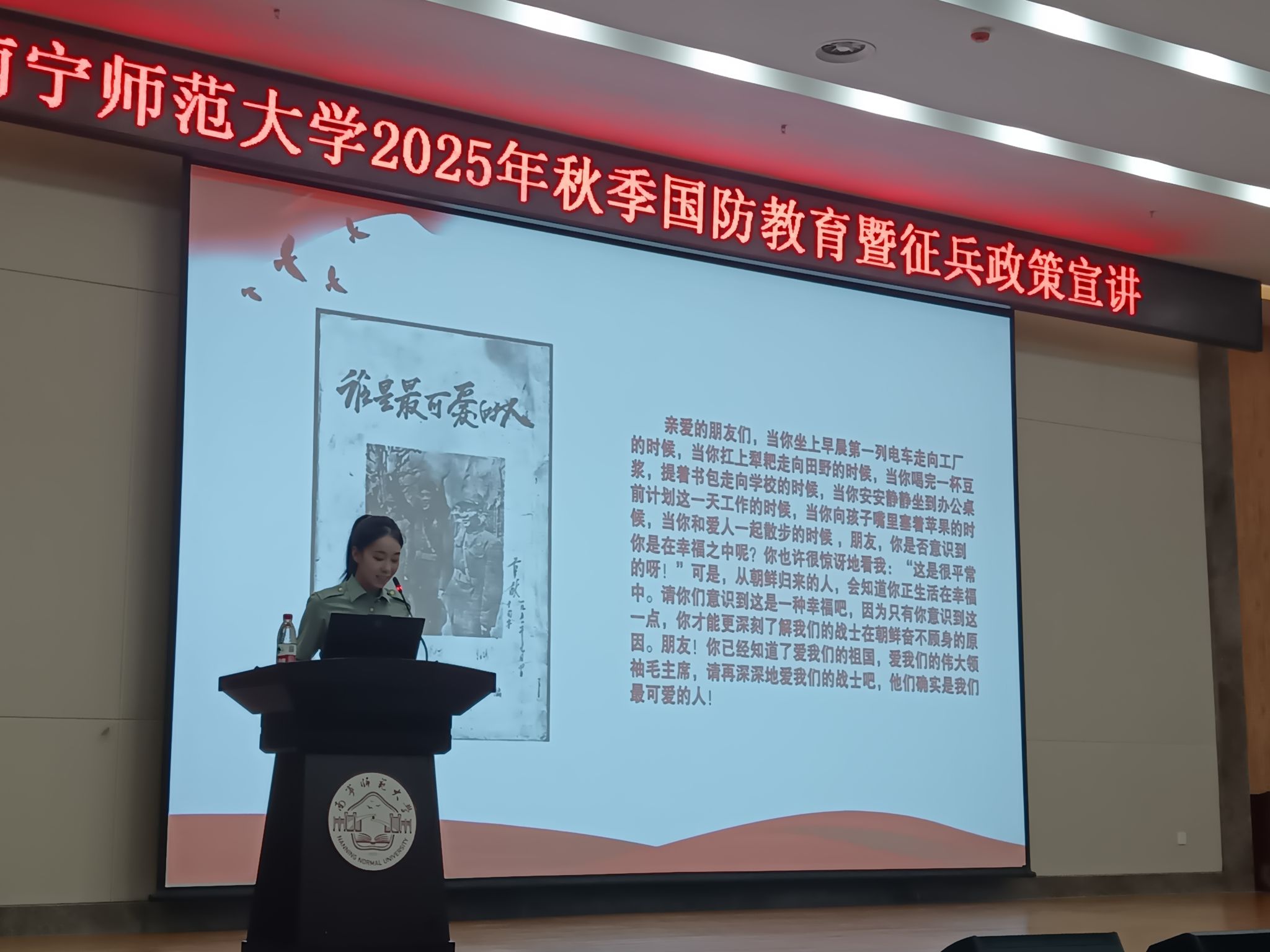 南宁市青秀区人民武装部部长吴之铁上校结合国际局势解析国防要义,重点解读2025年征兵新政:毕业生家庭优待金年增33505元、退役考研初试加分、直招军士专业目录等。详解"政治账""成长账",并展示高原演训装备操作视频,直观呈现军营技能培养体系。给同学们上了一堂精彩的国防教育课。