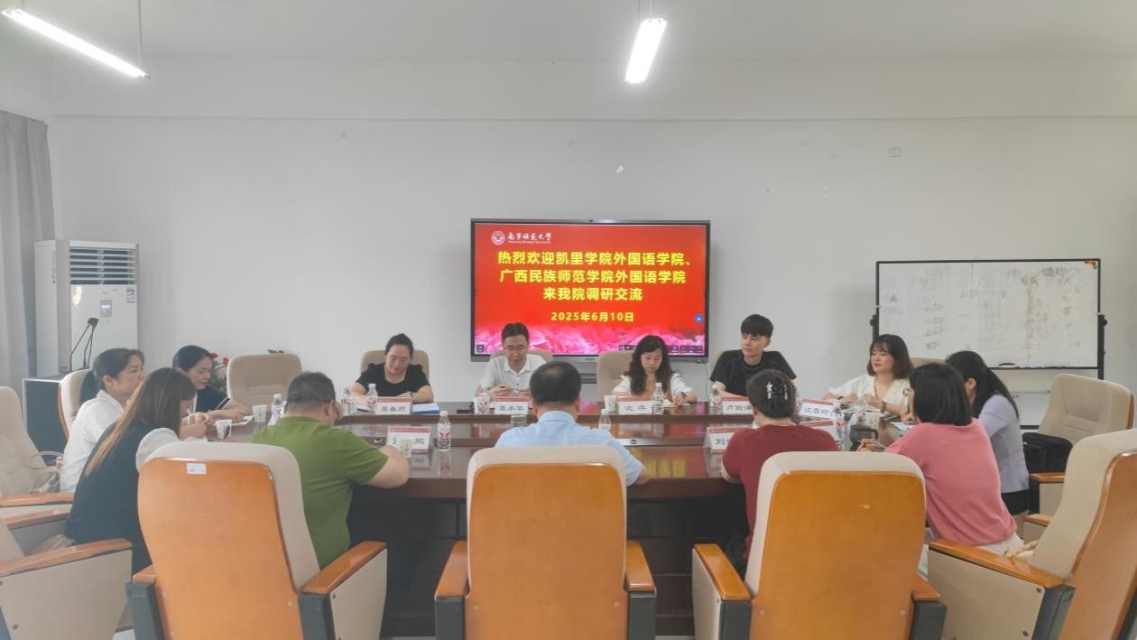2025年6月10日下午,广西民族师范学院外国语学院覃承华院长、凯里学院外国语学院沈萍副院长(主持工作)联合率队一行9人到best365官网外国语学院调研交流,外国语学院院长陈光伟、副院长张晓鹏、英语系主任刘婷婷、翻译教研室主任樊毅出席座谈会。
