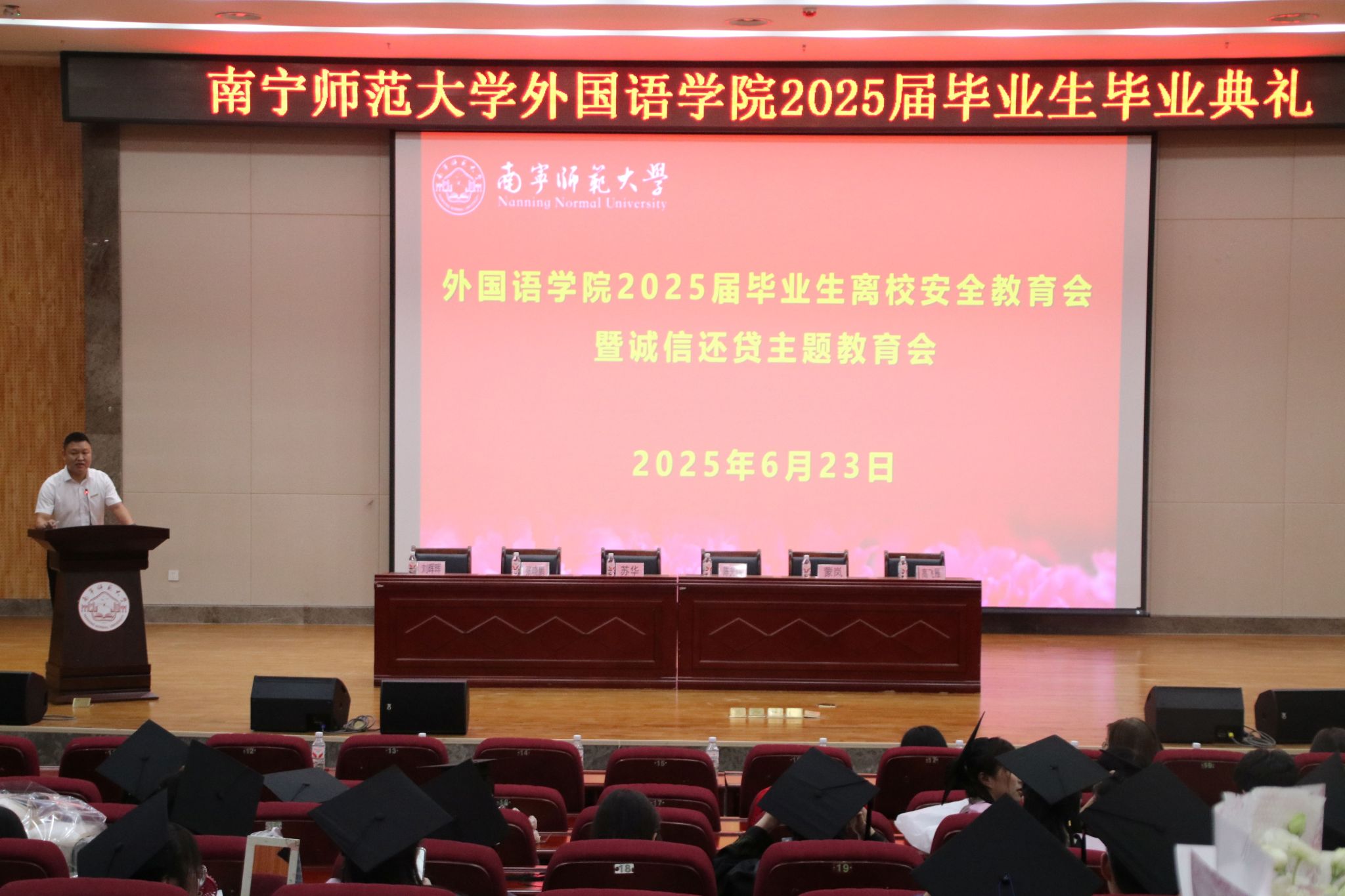为强化毕业生离校安全意识,明确国家助学贷款还款责任,夯实诚信做人的道德基础,6月23日上午,外国语学院在武鸣图书馆报告厅召开2025届毕业生离校安全教育会暨诚信还贷主题教育专题会议,会议由院党委副书记刘晖晖主持。