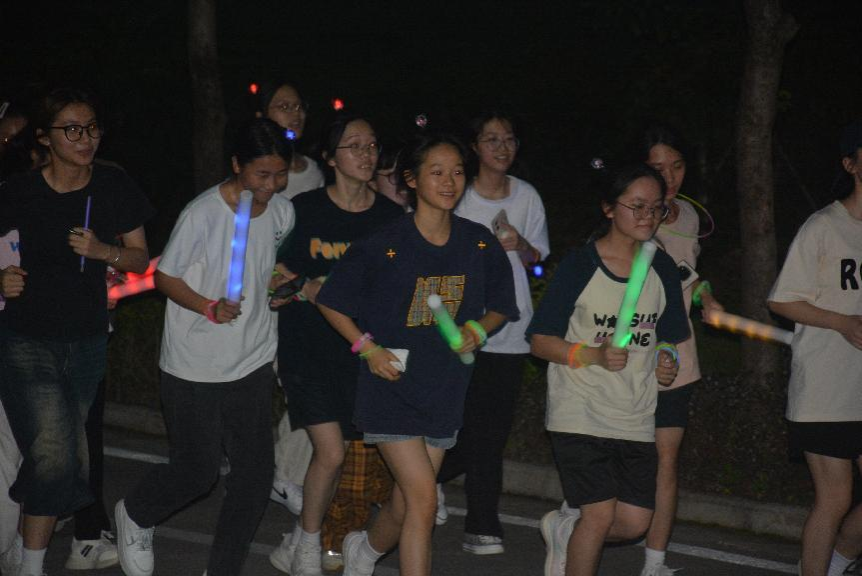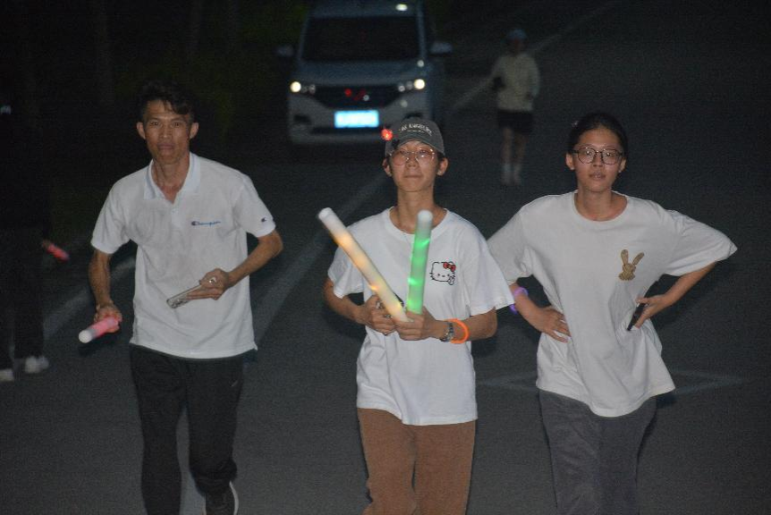 随后,同学们一起进行热身活动后,手持荧光棒,在领跑员与工作人员的引领下,沿着既定路线开启夜跑活动。夜跑过程中,同学们相互鼓励、并肩奋进,凝聚集体力量,生动诠释“热力青春”的活动内涵。