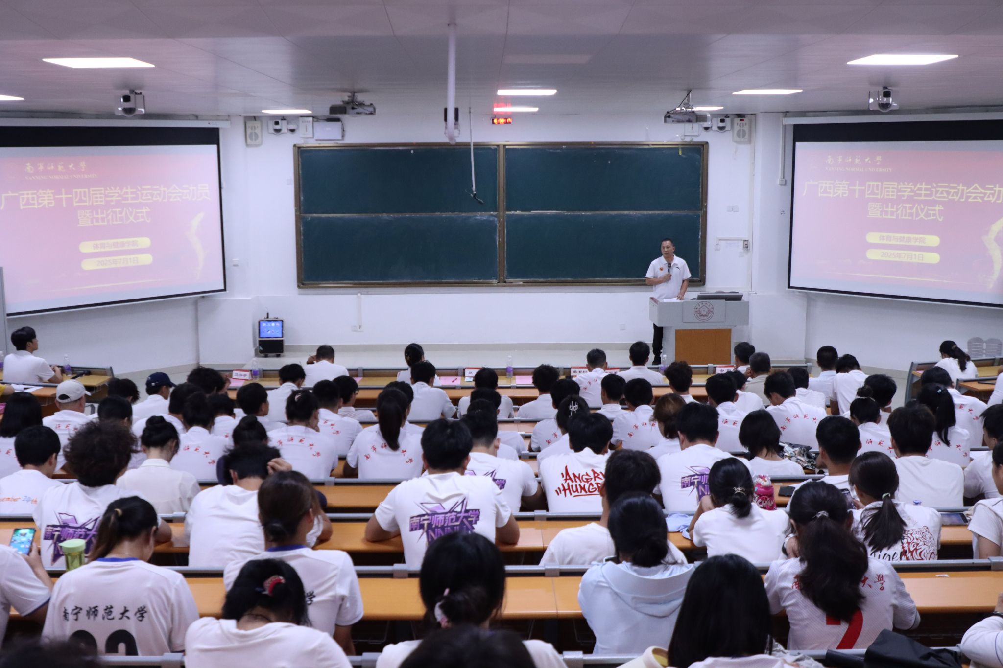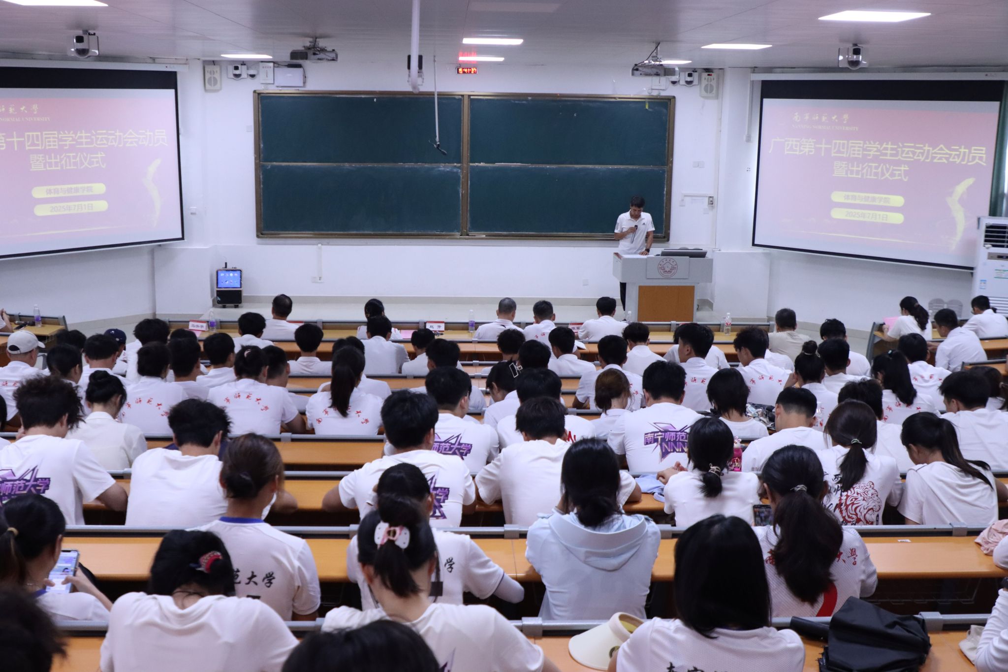 为全面贯彻新时代党的教育方针,推进学校体育事业发展,7月1日下午,广西第十四届学生运动会best365足球官网代表团出征仪式在武鸣校区2号教学楼109教室圆满举行。体育与健康学院党委书记磨有积、院长赵芳,党委副书记陈军弟、副院长孙健、余勋,各运动队领队、教练员、运动员参加出征仪式。会议由院长助理马泓宇主持。