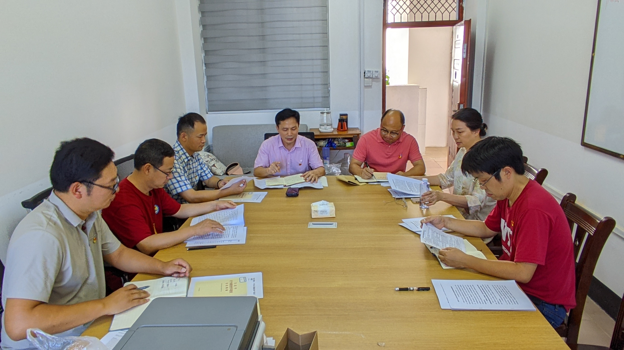 6月24日下午,数学与统计学院党委领导班子在明秀校区工会楼506会议室开展深入贯彻中央八项规定精神学习教育集体学习,学院党委书记余敢才主持会议,学院党委领导班子参加此次会议,学院部分党委委员、组织员列席此次会议。