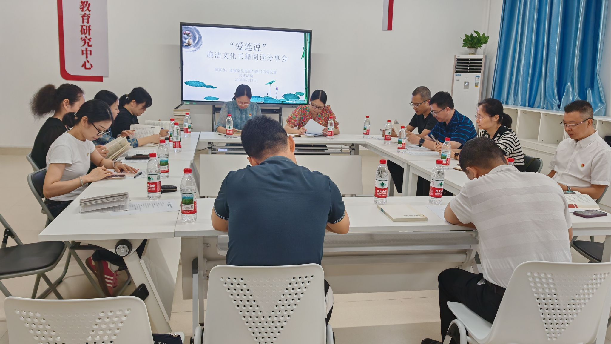 随后,“爱莲说”廉洁文化书籍阅读分享会将活动推向高潮。图书馆党员王明娟从“家风典范”“理论指南”“文学纪实”三个维度,对《清风传家》《严以治家》等五本好书进行导读。与会党员沉浸式阅读20分钟后踊跃发言,王卫彬、刘昕露、谭钧等党员分享了《人民的名义》《正风深一度》《清风习习》等书籍的阅读感悟。叶佩珍指出,希望通过此次的阅读分享,促使大家今后加强阅读和学习,筑牢廉洁防线,提升党性修养。同时大家还探讨了如何充分发挥图书馆的文化育人功能,加强图书馆在廉政文化方面的传播和引导。