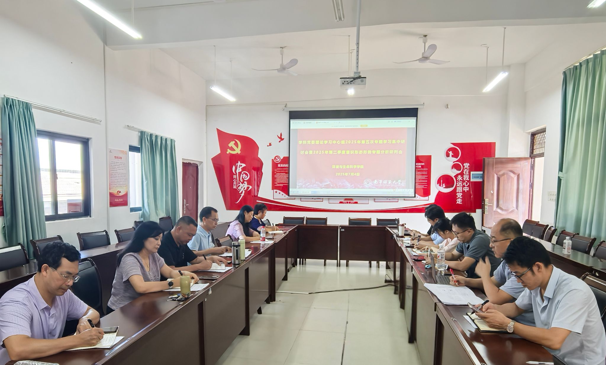 7月4日上午,环境与生命科学学院在武鸣校区地海楼B508室召开学院党委理论学习中心组2025年第五次专题学习集中研讨会暨2025年第二季度意识形态形势专题分析研判会。学校党委委员、政策法规与发展规划处处长邓军彪到会巡听旁听指导,学院党委理论学习中心组成员参加会议,会议由学院党委副书记(主持党委工作)韦东林主持。