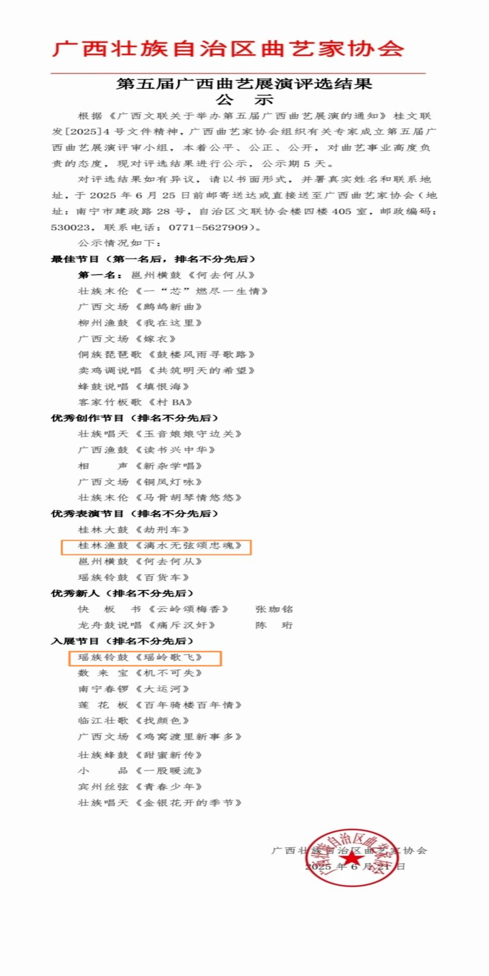 近日,在第五届广西曲艺展演中,我院声乐教师申婷表演的曲艺作品--桂林渔鼓《漓水无弦颂忠魂》荣获优秀表演奖、由学院师生们表演的瑶族铃鼓《瑶岭歌飞》获得入展节目奖。