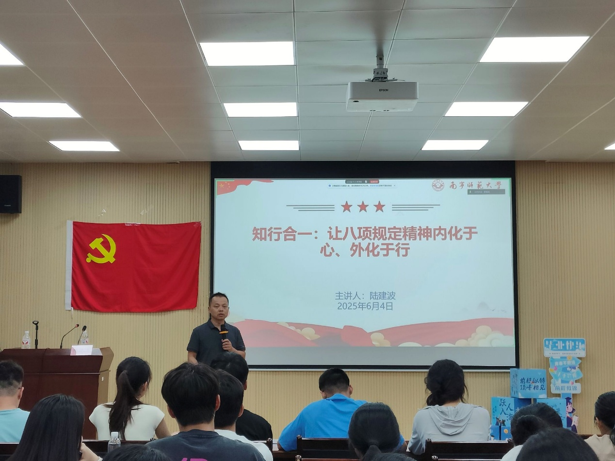 6月4日,学院副院长陆建波以“知行合一”为主题,为计算机研究生与专升本第一党支部党员讲授学习教育专题党课。他系统解读中央八项规定精神的核心和实质,并结合党的二十大对青年工作的战略定位,要求青年党员将纪律要求与时代使命相结合,在为中华民族伟大复兴的征程中践行使命担当。