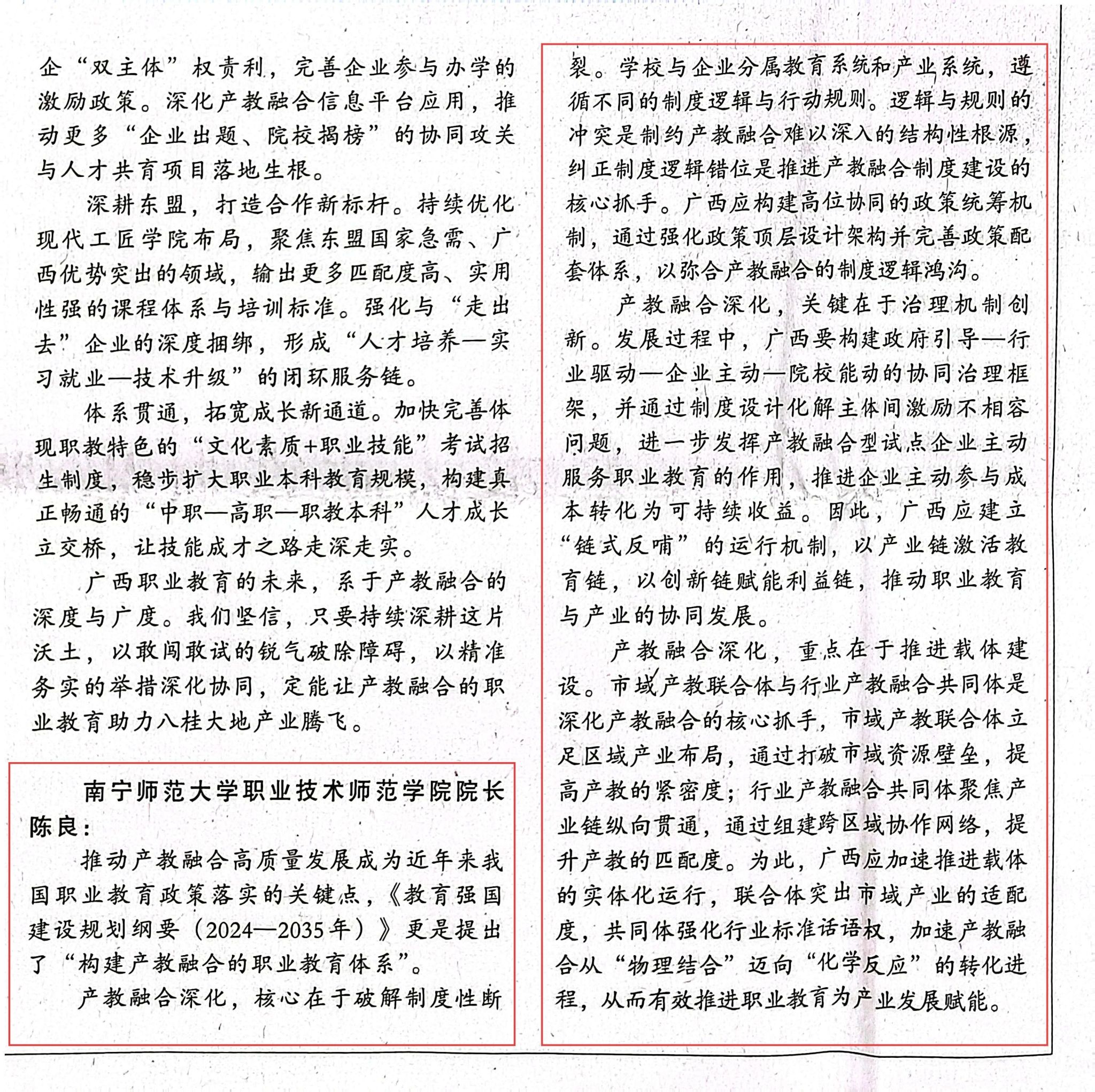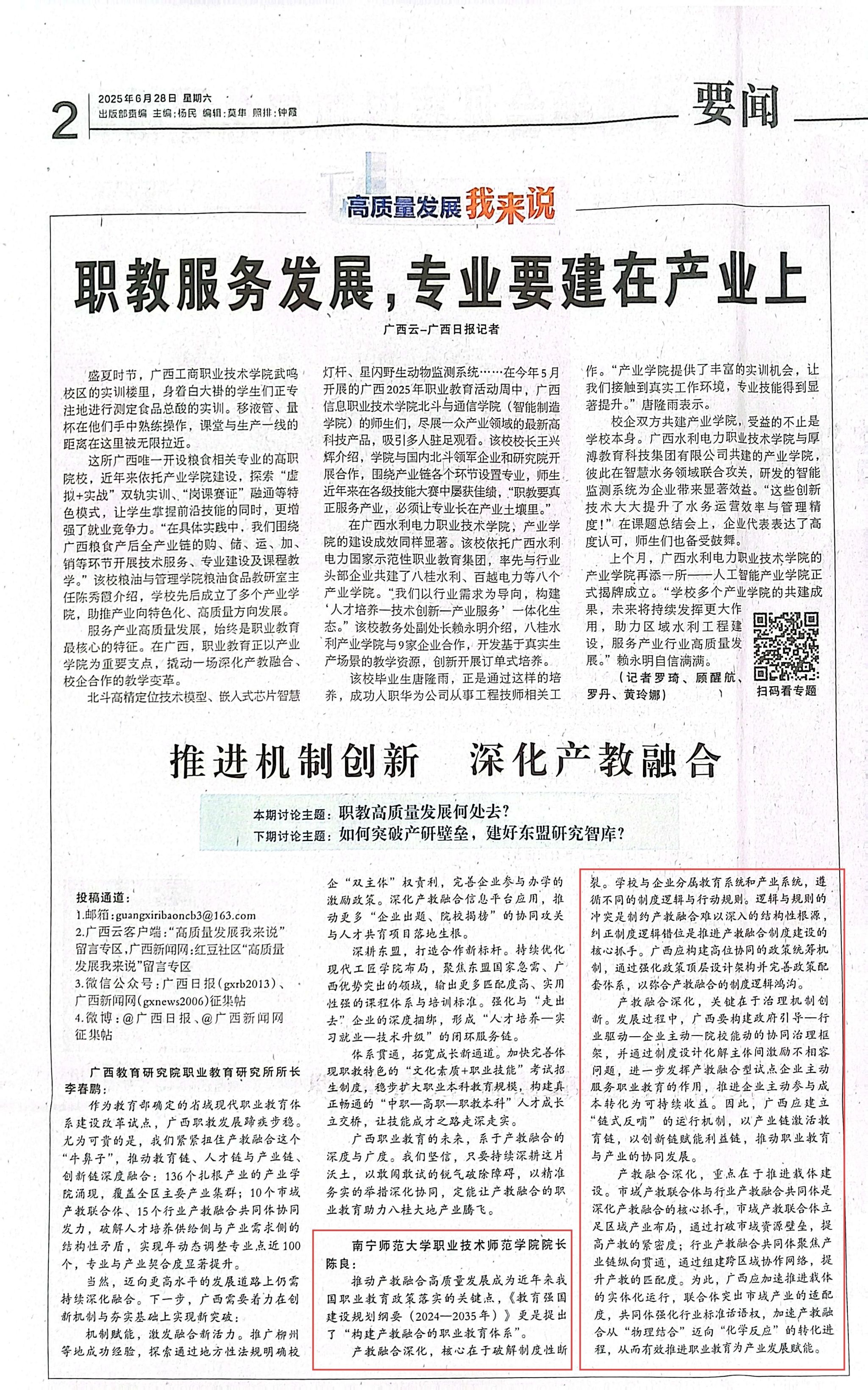 近日,best365官网职业技术师范学院陈良教授受邀参加《广西日报》专题访谈,围绕“职教高质量发展何处去?”主题发表了见解。陈良教授的论述既精准诊断了产教融合的制度性痛点,又提出了“政策统筹—协同治理—载体驱动”的创新路径,为广西构建产教深度融合的职业教育体系提供了兼具理论深度与实践价值的行动指南。