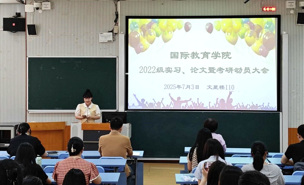 为统筹推进2022级学生培养工作,7月3日下午,国际教育学院在文星楼110教室召开2022级实习、论文、考研动员大会,全面部署相关工作。院长杨绪明、教学副院长蒋招凤、党委副书记潘夏宁,22级班主任及各实习方向带队教师,2022级汉语国际教育专业全体学生参会。