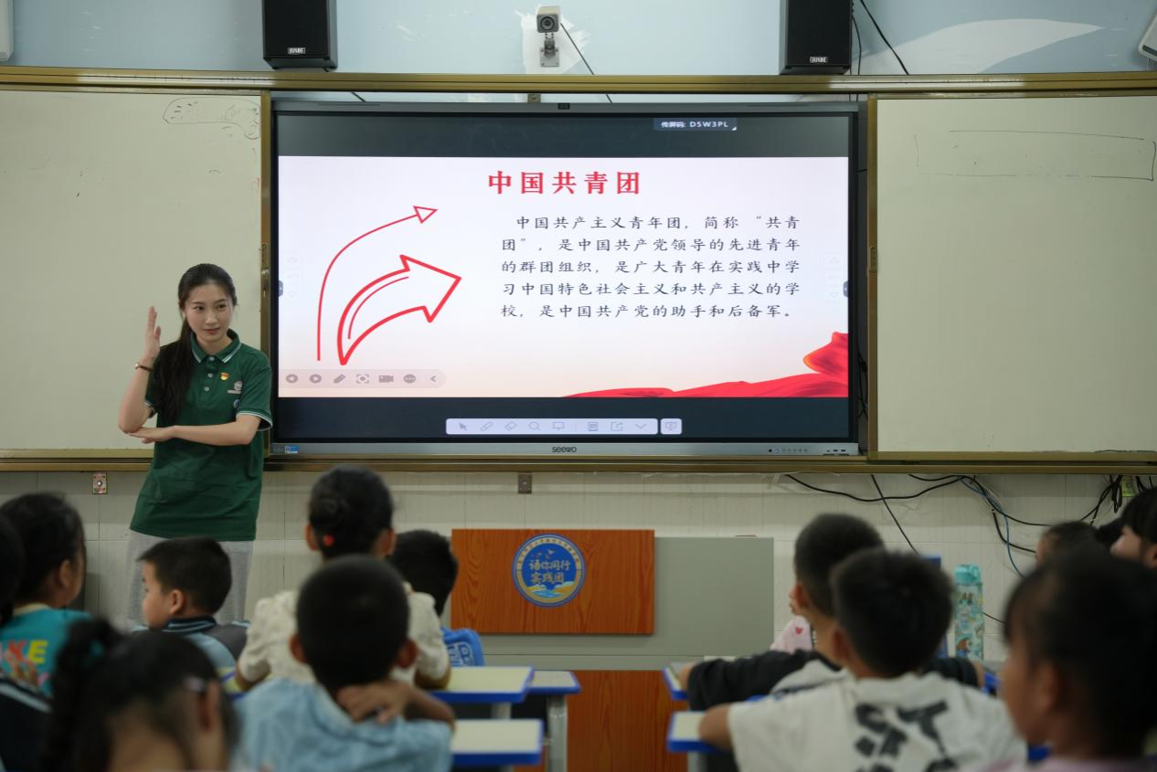 宣讲组成员朱敏祺作为学生党员,在党史团史传播的课堂中讲解了中国共产党和共产主义青年团的相关知识,带领同学们认识了党徽、党旗和团徽、团旗,并且强调了中国共产党和中国共青团之间的关系。朱敏祺还为同学们播放了与抗美援朝战争相关的动画片,她讲述了黄继光、邱少云这两位红色模范人物的抗战故事,阐述了抗美援朝战争对于捍卫新中国和平与尊严的伟大意义。通过课堂,宣讲组成员让伟大抗美援朝精神能够跨越时空,在新时代少年心中焕发出催人奋进的力量。