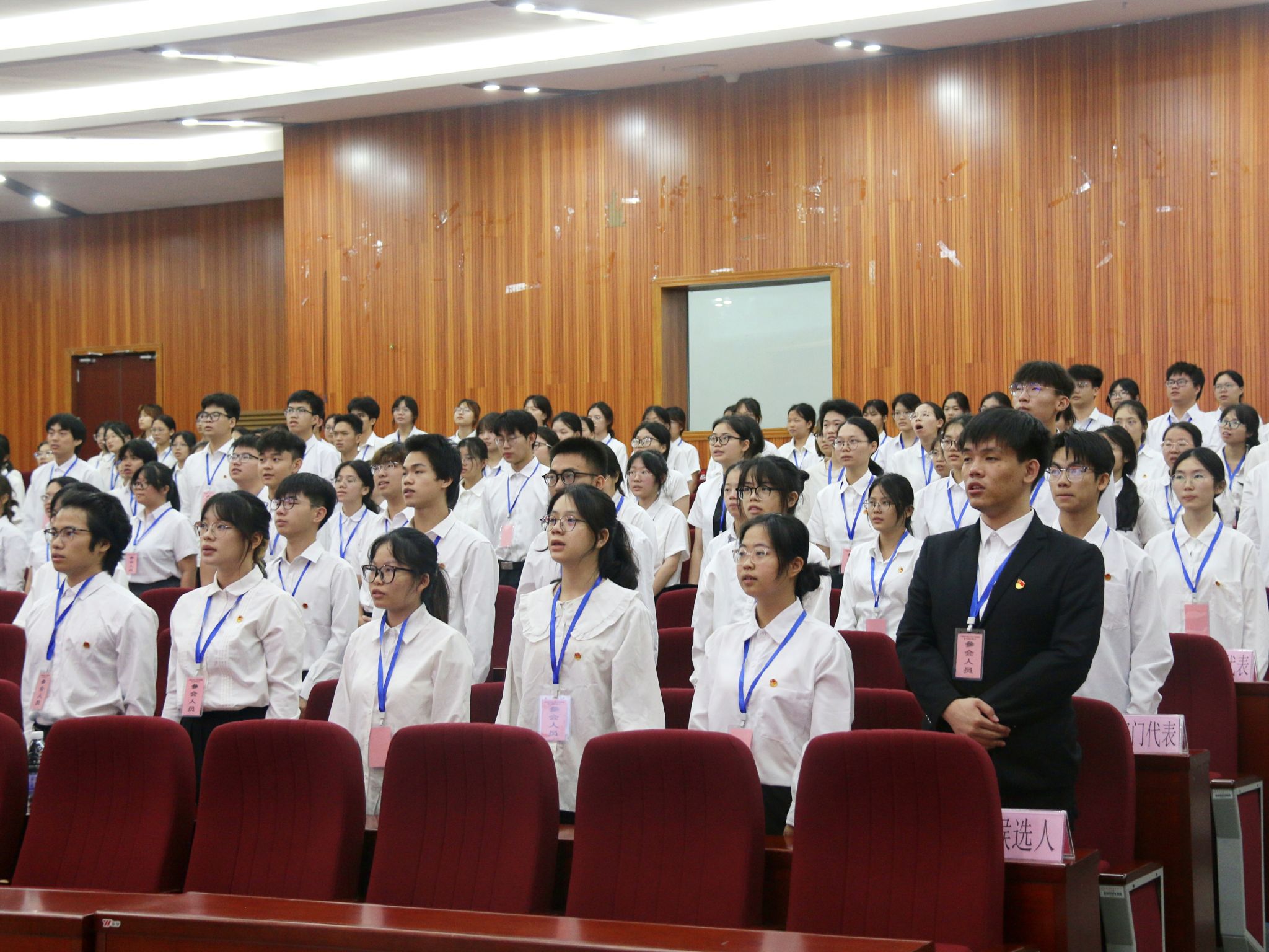 6月22日9:00,大会正式会议在武鸣校区图书馆报告厅召开,会议在庄严的国歌声中开幕。学院党委副书记陈今浩首先致辞,他肯定上一届团委在思想引领、组织建设、服务青年等方面的工作成效,并对新一届团委提出殷切期望。校团委书记区丽媛在贺词中强调,青年团员要牢记使命,勇挑重担,为学院和学校发展贡献青春力量。