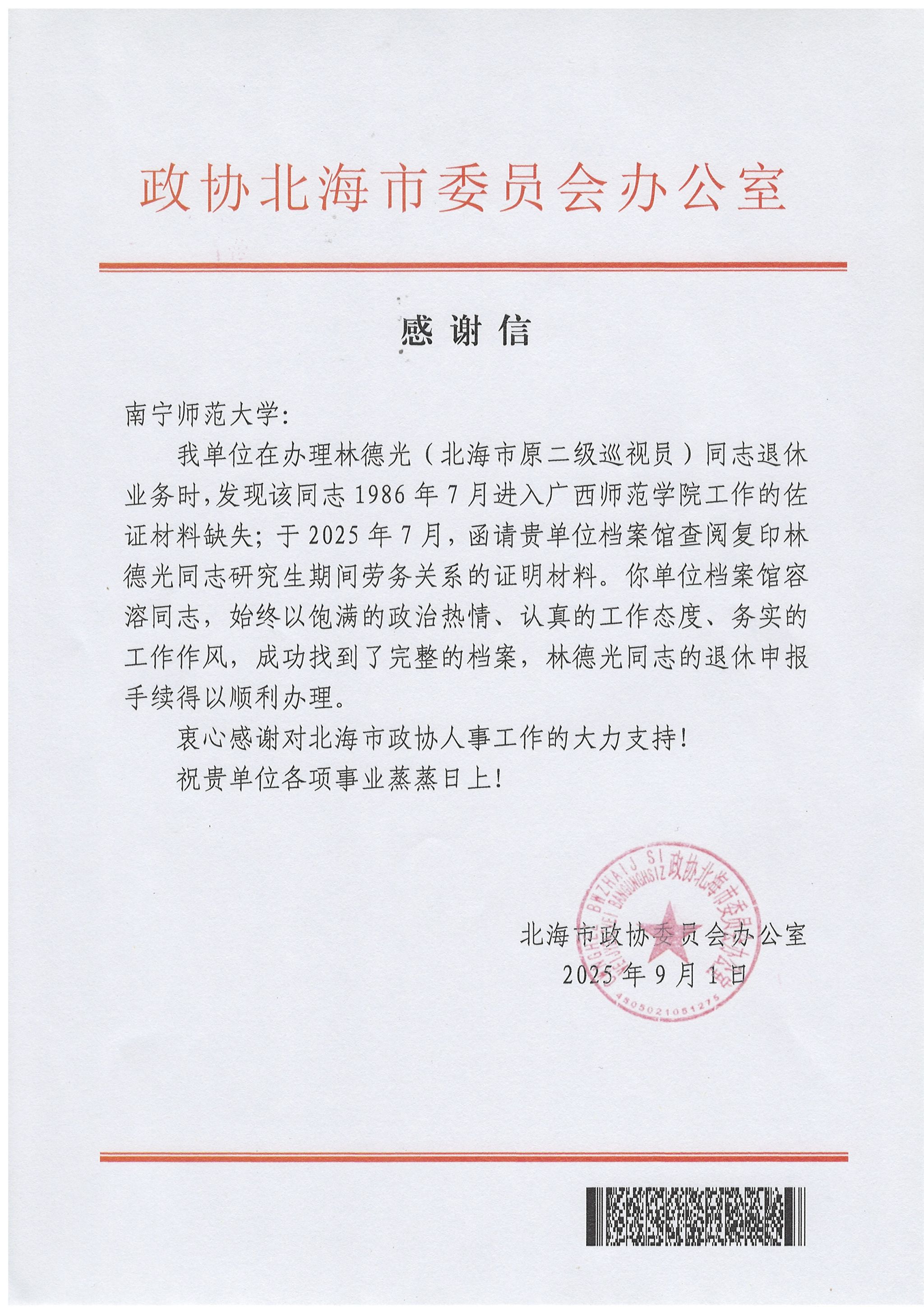 近日,best365官网收到来自政协北海市委员会办公室的感谢信,信中对best365官网档案馆容溶同志高效精准的档案服务予以高度赞扬,感谢其助力解决北海市原二级巡视员林德光同志退休手续办理中的关键档案难题,充分彰显了best365官网档案管理工作的专业素养与服务担当。