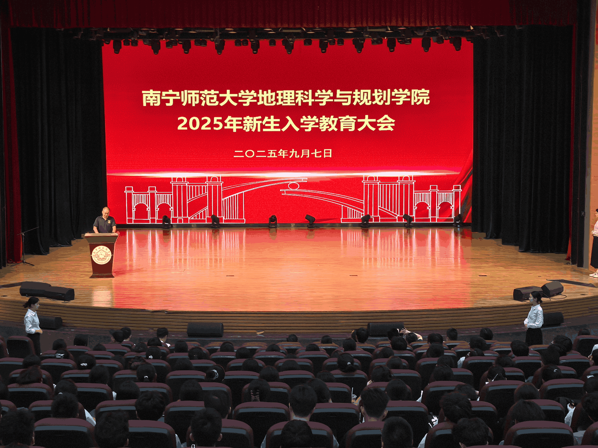 9月7日下午,地理科学与规划学院在武鸣校区1号报告厅召开2025级新生入学教育大会。学院领导班子成员、各系教师代表、全体辅导员及学院2025级全体新生参加。