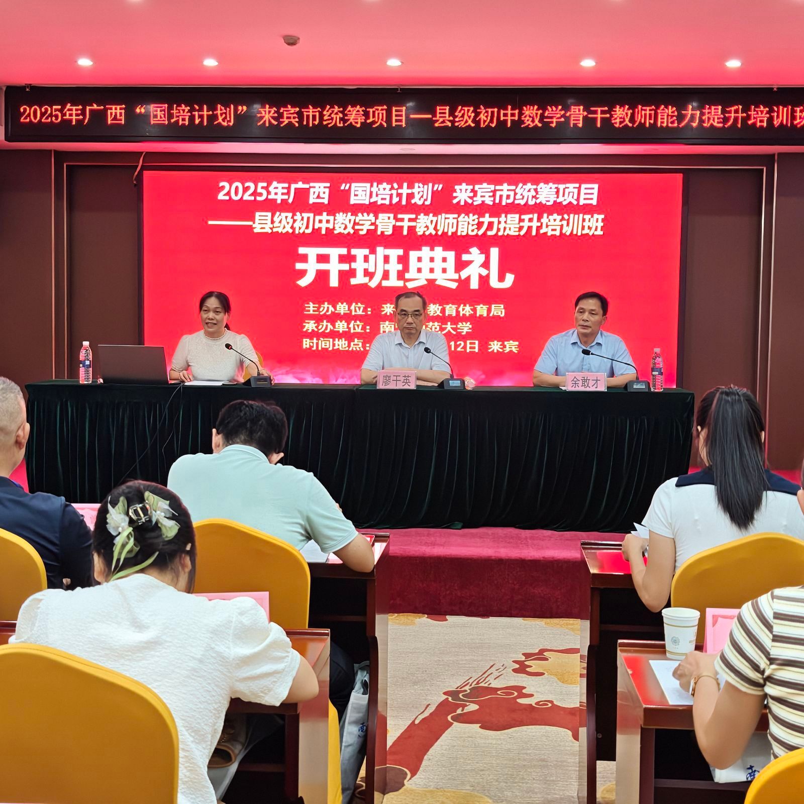 来宾市教师培训中心主任廖干英出席开班典礼并致辞。廖主任对学员们提出了殷切的希望和明确的要求。他指出,在当前教育改革不断深入的大背景下,提升教师的专业素养和教学能力刻不容缓。此次“国培计划”为大家提供了宝贵的学习机会,希望全体学员珍惜此次难得的培训契机,以积极的学习态度、饱满的学习热情全身心投入到培训中。