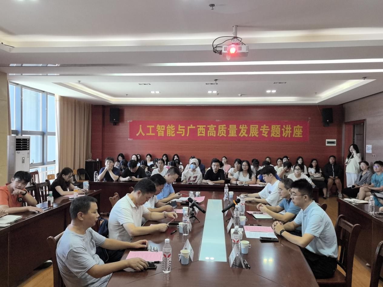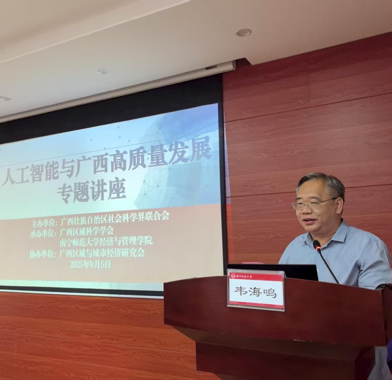 为深入学习贯彻习近平总书记关于人工智能的重要论述,贯彻落实自治区党委关于发展人工智能赋能千行百业的决策部署,聚焦人工智能与广西经济社会各领域融合发展的关键问题,探索高质量发展新路径、新动能。9月5日,由广西壮族自治区社会科学界联合会主办,广西区域科学学会与best365足球官网经济与管理学院承办,广西区域与城市经济研究会协办的“人工智能与广西高质量发展”专题讲座在学校五合校区顺利举行。本次讲座由经济与管理学院党委书记韦海鸣教授主持,来自校内外专家、学者约60人参会。