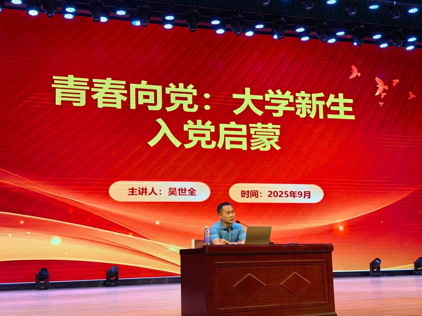 接着,吴世全老师鼓励2025级本科新生积极了解入党流程,端正入党动机,争当信仰坚定的先锋榜样。他为同学们规划了清晰的大学阶段行动路线图,助力同学们深化对党的性质、宗旨和使命的理解,坚定入党初心,以实际行动向党组织靠拢。