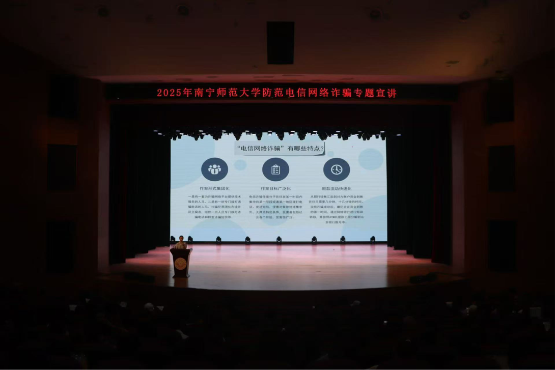 10月21日下午,由学校学生工作部与保卫处组织,音乐与舞蹈学院与物流管理与工程学院共同承办的防范电信网络诈骗专题宣讲会在音舞楼1号报告厅顺利举行,南宁市公安局武鸣分局反诈中心邓幸梓警官受邀担任主讲嘉宾,两院2025级新生共同参与活动。