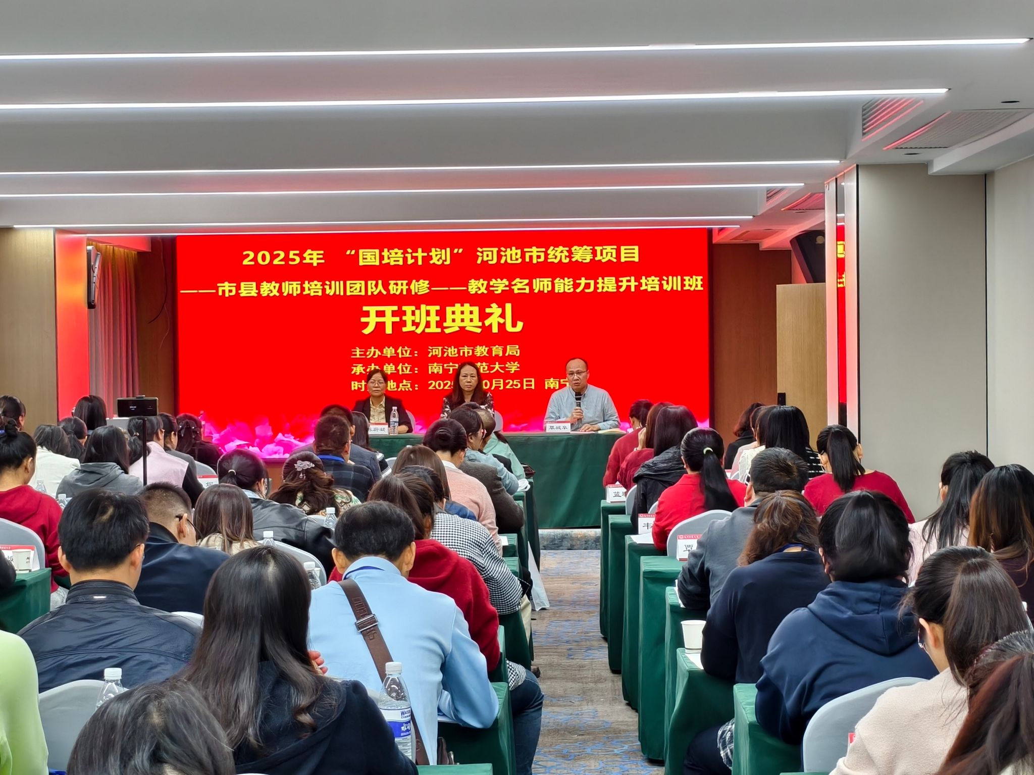 2025年10月25日,2025年“国培计划”河池市统筹项目——教学名师能力提升培训班在best365足球官网正式开班。本次培训为期8天,将持续至11月1日,旨在进一步提升河池市中小学教学名师的专业素养与教学能力,来自河池市各县区的近百名中小学教学名师共同参与此次培训。