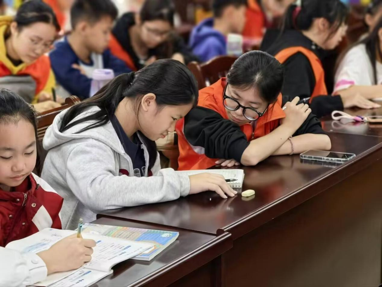 看到小朋友们的眼神中流露出对知识的渴望,脸上洋溢着愉悦而又坚定的神情,2024级数本2班的梁锦源以杨辉三角为切入点,拆解数学奇妙规律,穿插高斯、牛顿的趣味小故事,瞬间点燃小朋友们的兴趣,同时也拉开本次爱心辅导活动的帷幕。张健结合自身经历分享经验与感受,感谢志愿者的无私付出,希望通过活动帮孩子们找到数学乐趣、提升学习信心。辅导员卢若楷向社区对活动的大力支持表示感谢,并鼓励志愿者珍惜实践机会,传承前三期爱心辅导活动的优良传统,以实际行动践行“德才并育,知行合一”的校训,传递数学的知识与魅力。学生党建常务封艾利为志愿者送上贴心建议,同时感谢社区搭建实践平台。仪式尾声,全体人员拍摄温馨合影。随后志愿者们与小朋友们一对一结对,开展耐心答疑与细致辅导。
