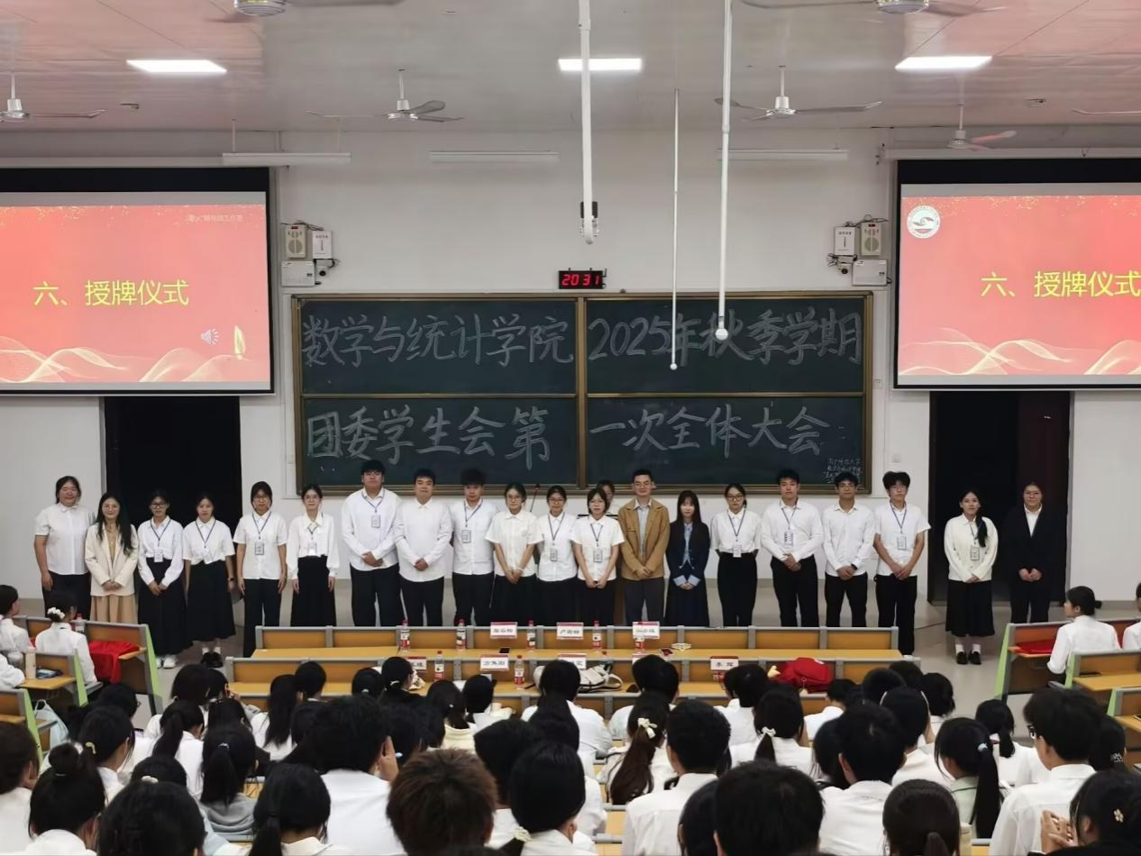 为帮助同学们清晰了解学院学生组织架构与工作方向,进一步加深对学院、学校的认同感与使命感,10月27日,数学与统计学院2025 年秋季学期团委学生会第一次全体大会在实验2-A105教室顺利召开。学院党委副书记王卫彬,团委书记梁卡霖,相关辅导员和老师,团委学生会常委及全体成员齐聚一堂,以青春之名赴约,为新学期团学工作注入新活力。