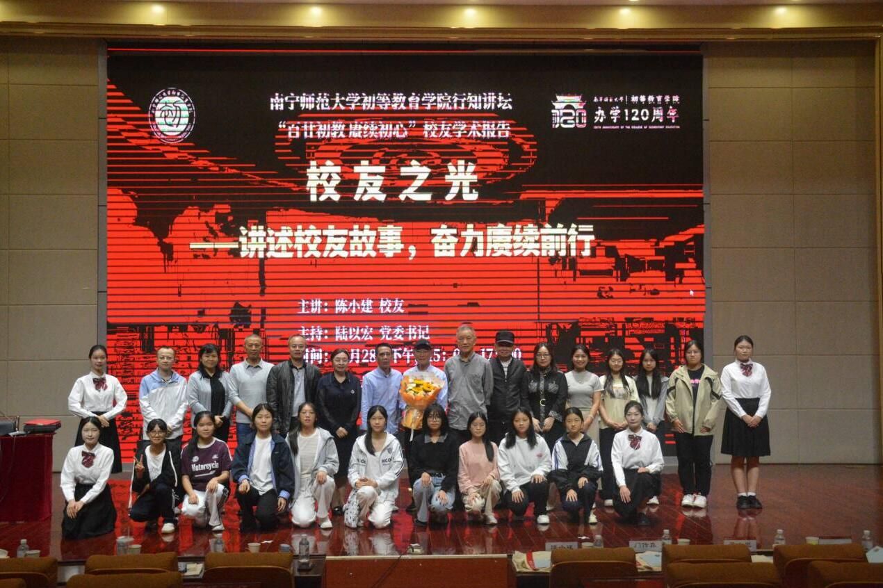 报告在师生代表与陈小建校友合影留念中落下帷幕。此次报告既深化了师生对院史与校友文化的认知,也为师范生传递了成长的精神力量。后续学院将继续邀请优秀校友返校,以“行知讲坛”为纽带,凝聚校友资源,助力学子成长为新时代优秀教育工作者。