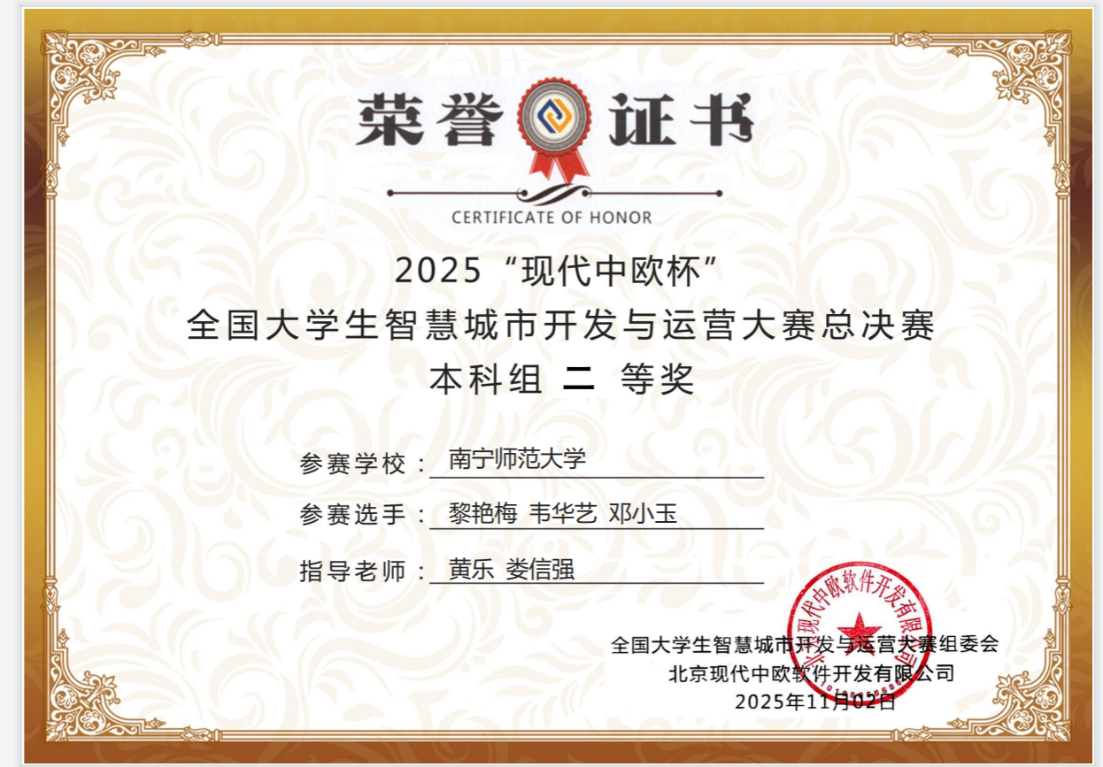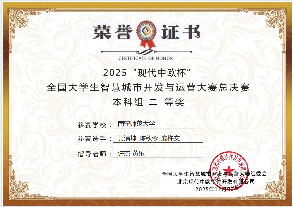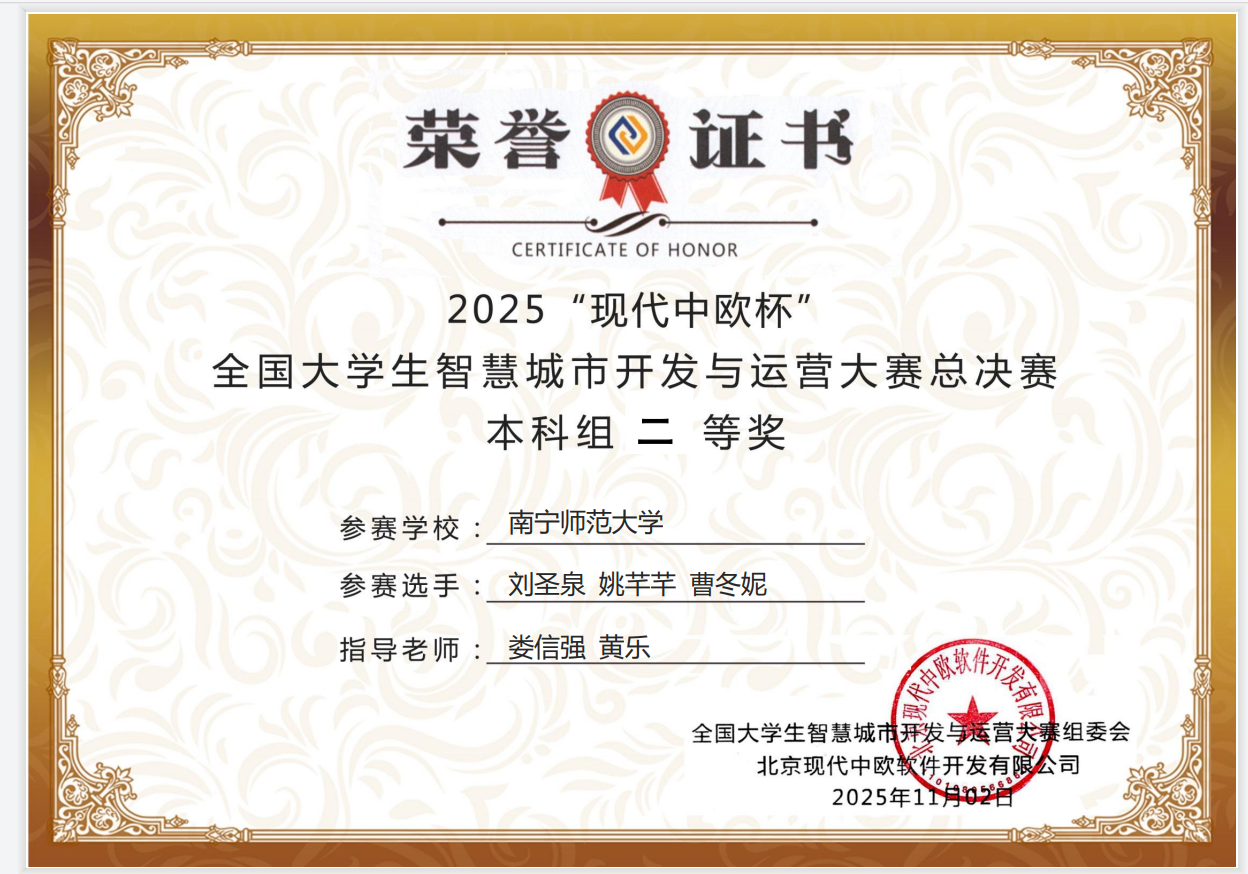 2025年11月1日,best365官网自然资源与测绘学院房地产开发与管理专业学生参加了2025“现代中欧杯”全国大学生智慧城市开发与运营大赛全国总决赛,由娄信强主任,黄乐老师,许杰老师指导的3支队伍在本次比赛中表现卓越,荣获全国二等奖3项。