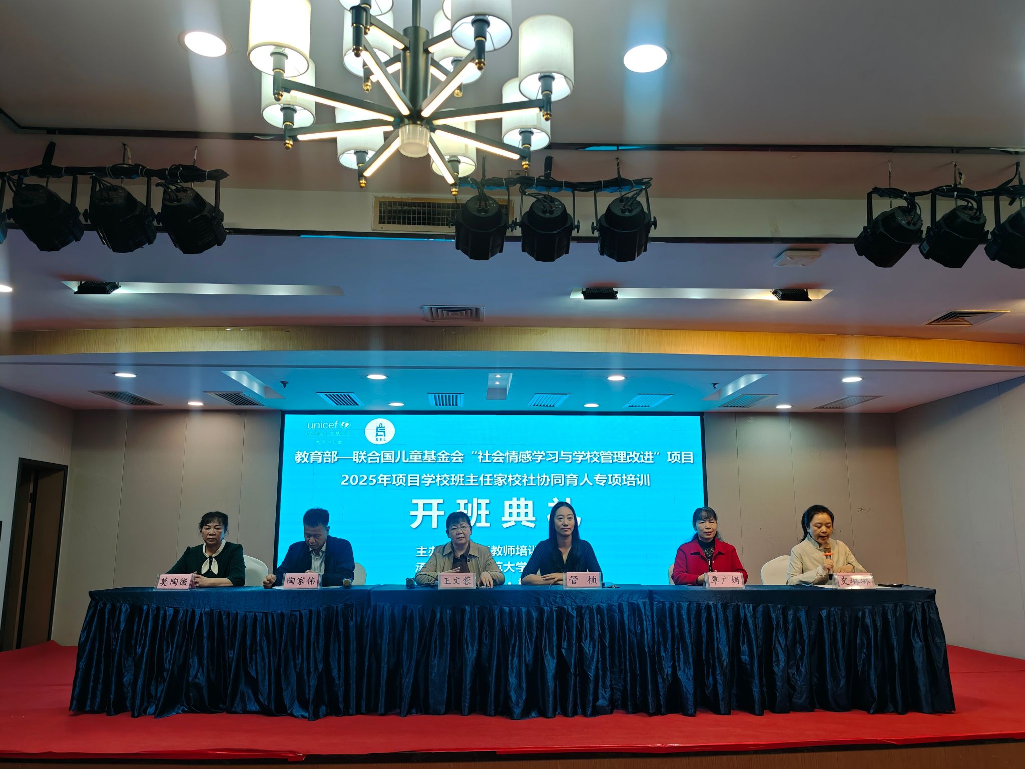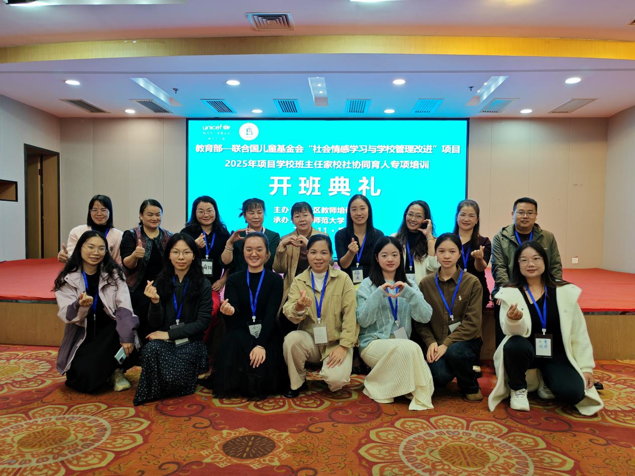 2025年11月6日上午,教育部—联合国儿童基金会“社会情感学习与学校管理改进”项目2025年项目学校班主任家校社协同育人专项培训在柳州正式启动。best365官网教师教育学院院长王文蓉,联合国儿童基金会顾问管帧、柳州市教师发展学校校长陶家伟等领导专家出席。来自玉林市容县、河池市环江县等地的项目负责人、县级专家及参训教师参加。开班仪式由自治区项目执行办史琳琳老师主持。